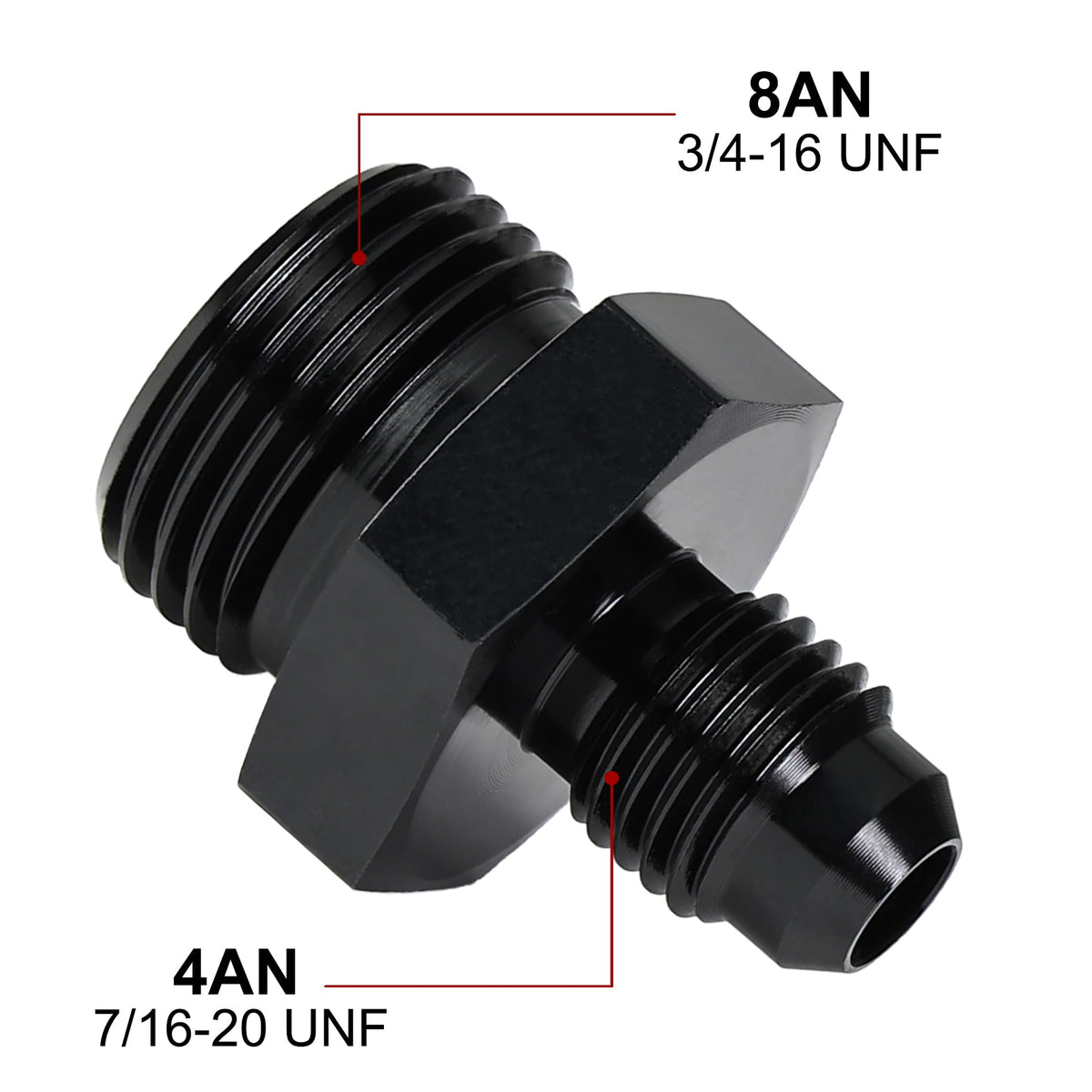 Q: What is the thread size for the EVIL ENERGY 4AN to 8AN adapter?A: The thread size for the 4AN side is 7/16-20 UNF, while the 8AN ORB side has a thread size of 3/4-16 UNF.