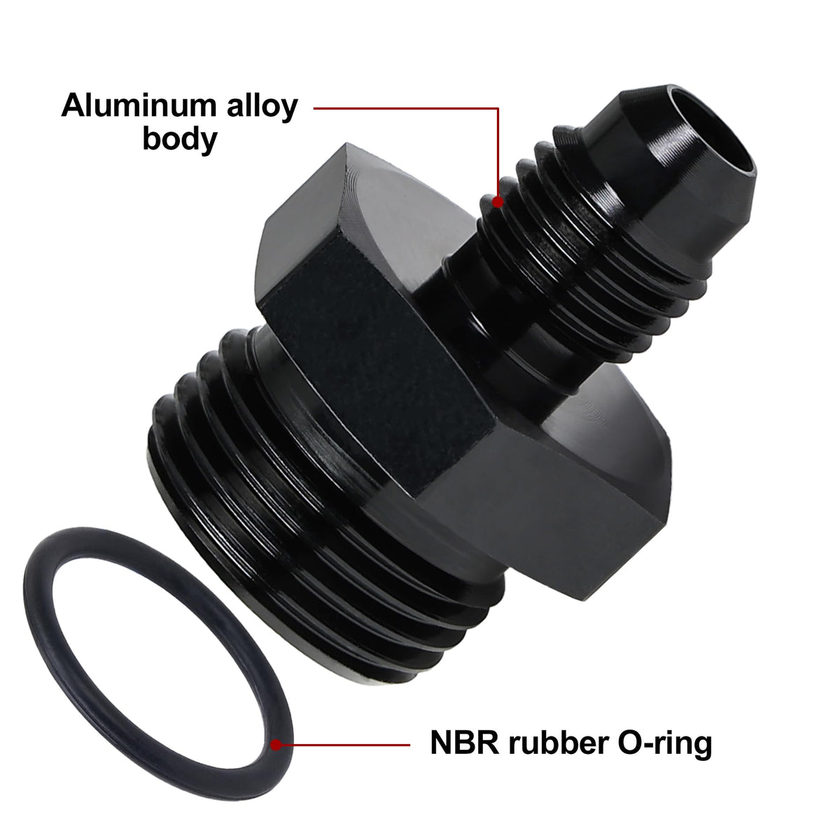 Q: What materials are used in the construction of this fuel rail adapter?A: This adapter is made of a durable aluminum alloy 6061-T6 for the body and features a NBR rubber O-ring for sealing.