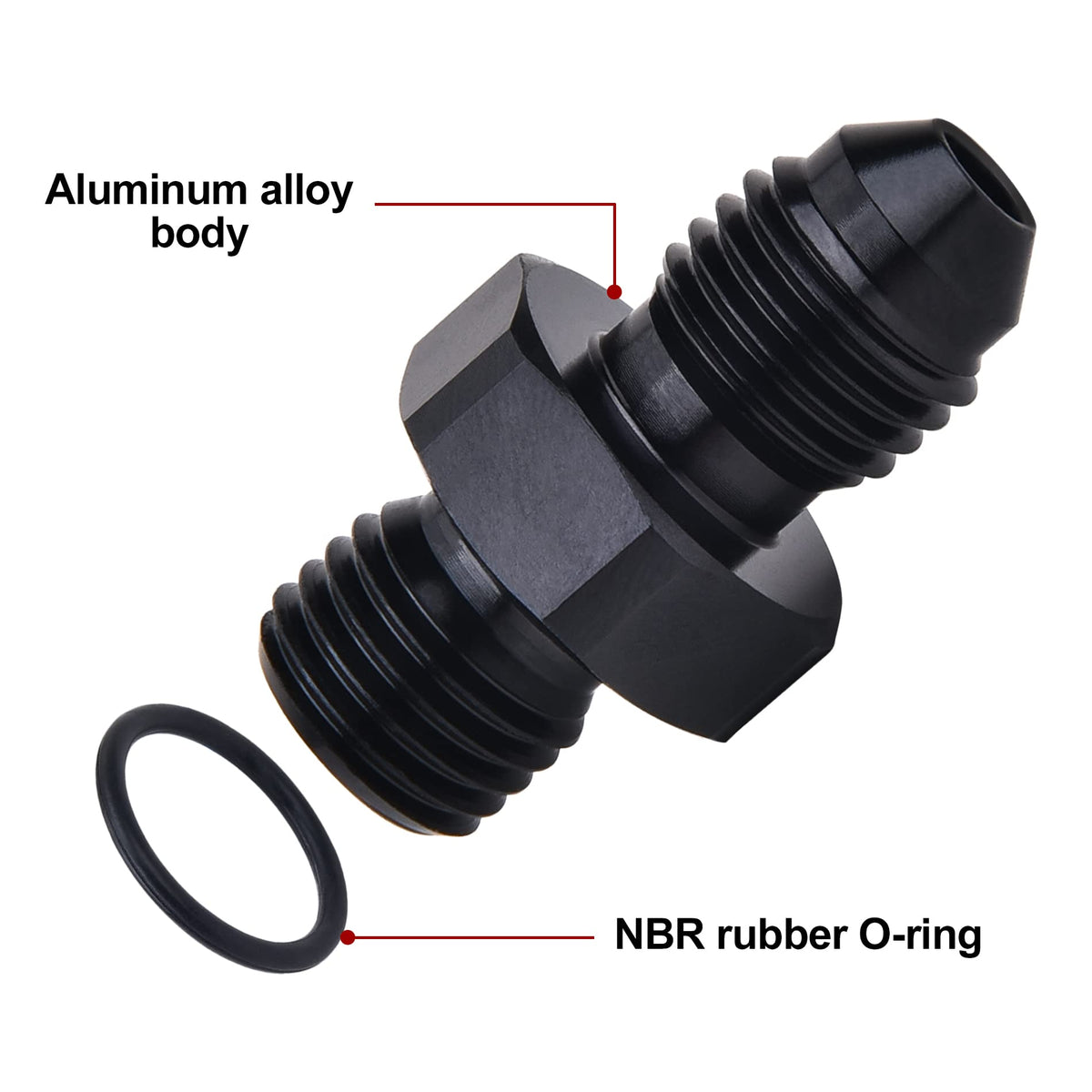 Q: What materials are used in the construction of this fitting adapter?A: The fitting adapter is made of aluminum alloy 6061-T6 for the body and features a NBR rubber O-ring for sealing.