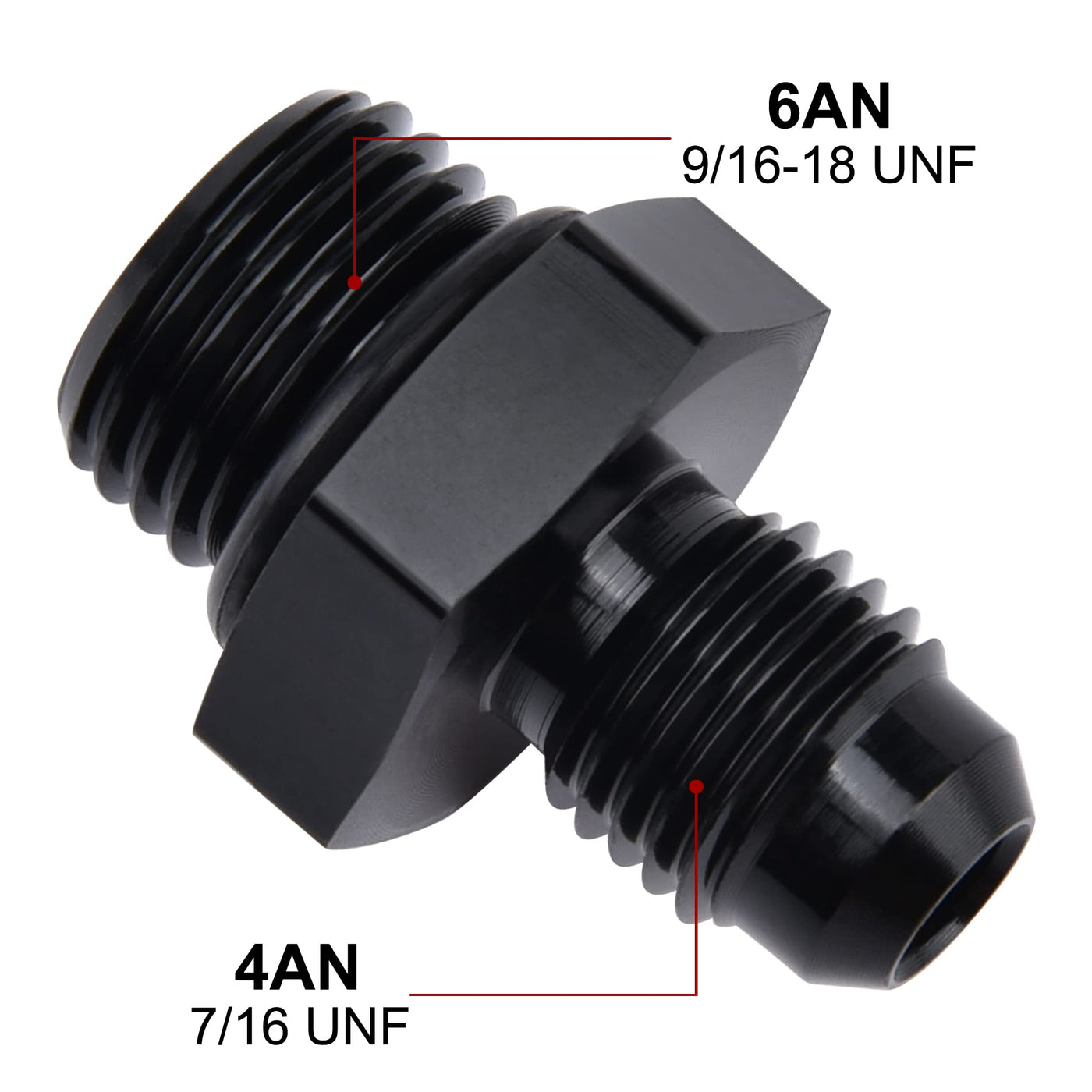 Q: What is the size and thread specification of the EVIL ENERGY 4AN Flare to AN6 ORB Male O-Ring Fitting Adapter?A: The EVIL ENERGY 4AN Flare to AN6 ORB Male O-Ring Fitting Adapter has a thread size of 4AN which is 7/16-20 UNF, and the AN6 ORB side has a thread size of 9/16-18 UNF.