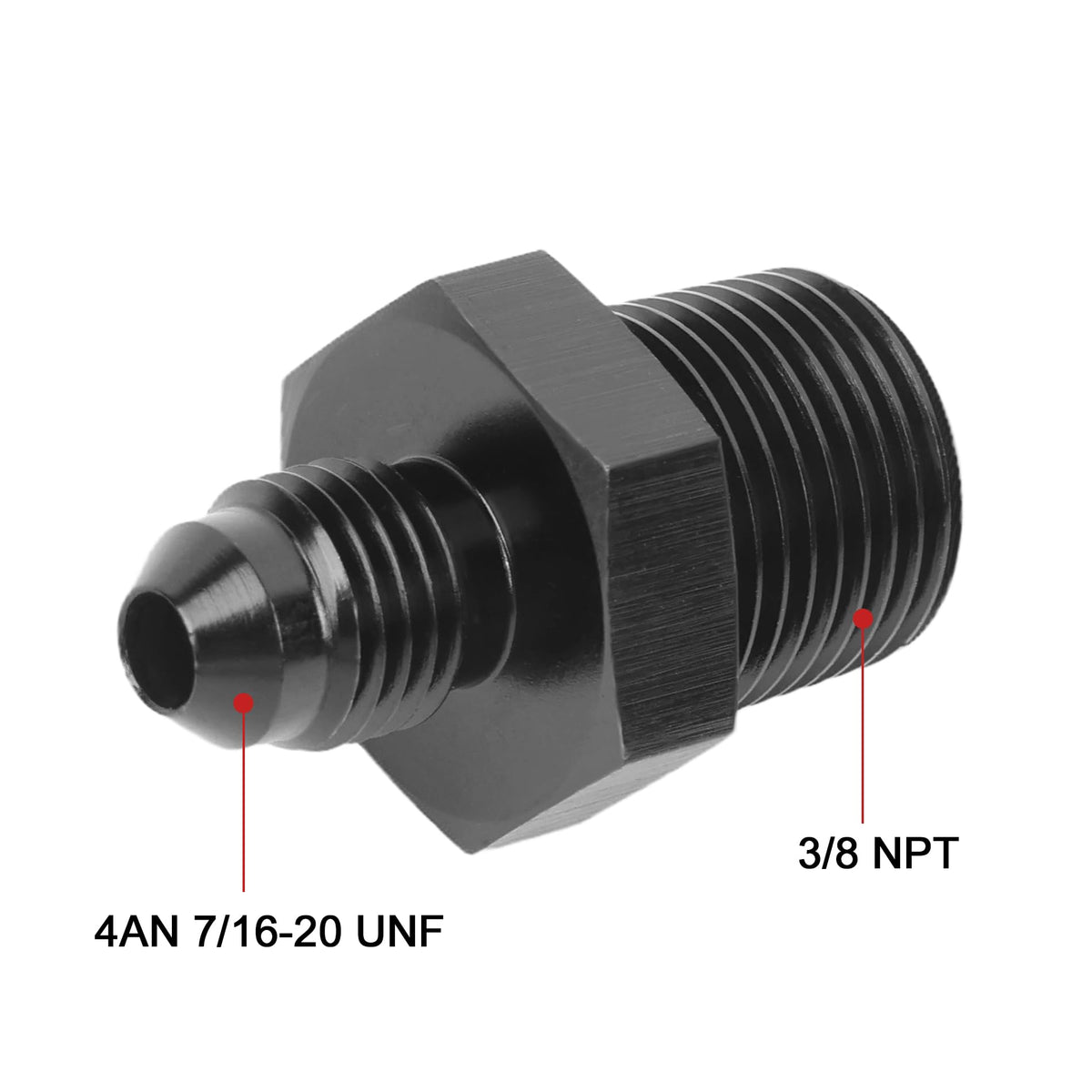 [Size] AN4 to 3/8'' pipe, the thread size of 4AN is 7/16-20 UNF. | [Material] Made of aluminum alloy 6061-T6, anodized black surface, bright appearance, anti-corrosion. | [Sealing] The AN side of the flare is sealed by a 37 degree angle and the NPT thread side is sealed by a 60 degree tapered thread. | [Application] Widely used in fuel system, cooling system, power steering system, etc. | [Notice] To ensure no leakage at the NPT end, sealant or PTFE tape is strongly recommended. Easy installation and removal with wrench.
