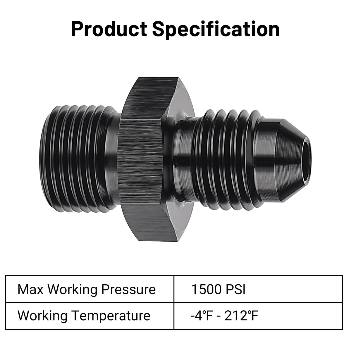 Size: The thread size of 4AN is 7/16-20 UNF and that of metric side is M12 x 1.0mm. | Sealing: The AN side of the flare is sealed by a 37 degree angle and the metric thread side is sealed by an o-ring. | Parameter: Working pressure: 1500PSI; Working temperature: -4