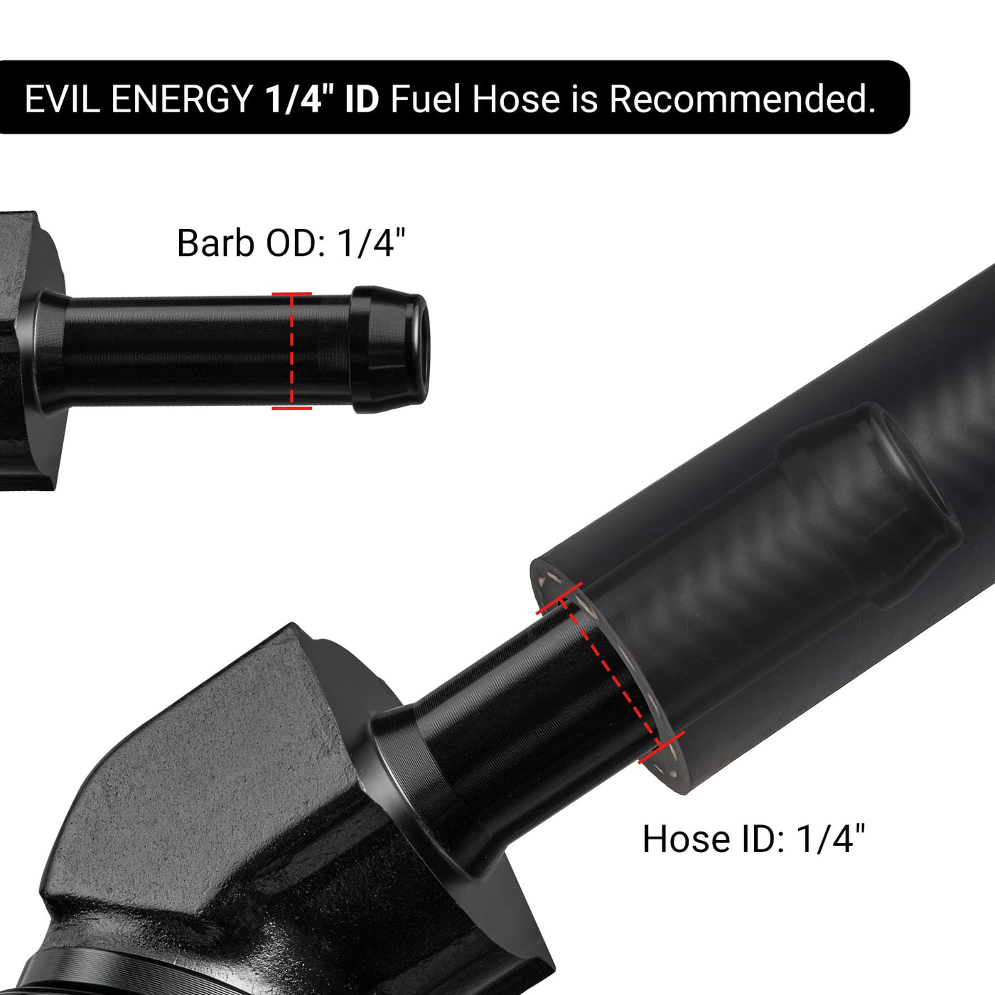 EVIL ENERGY is our brand, we're a direct and professional manufacturer, one of greatest manufacturer and exporter in tuning parts include intake system, exhaust system, fuel system, cooling system, interior and exterior parts. The 6an to 1/4 inch barb is used for pipe link, widely used in fuel system. The barb fitting is made of aluminum alloy 6061-T6 with a black anodized finish. Note: When installing fittings, it is recommended to use clamps to ensure sealing.