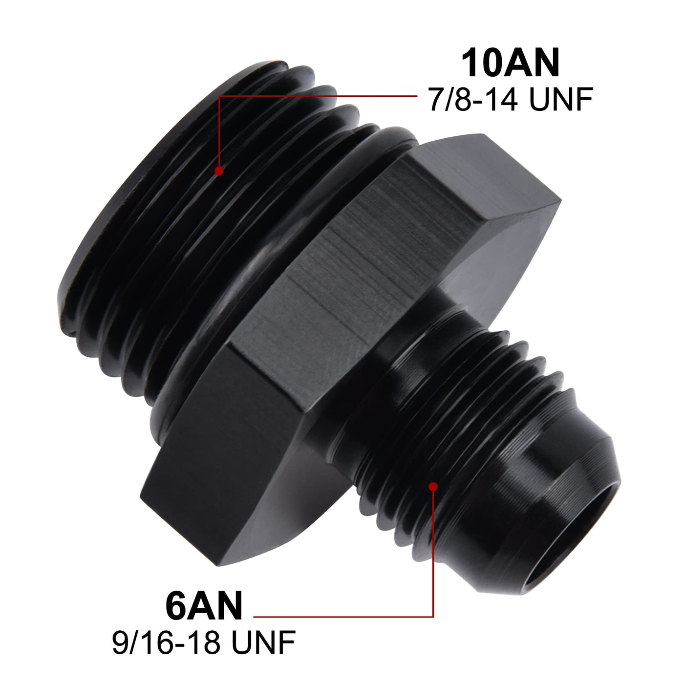 Q: What is the thread size for the EVIL ENERGY 6AN to AN10 ORB fitting?A: The thread size for the 6AN fitting is 9/16-18 UNF, while the thread size for the AN10 ORB fitting is 7/8-14 UNF.