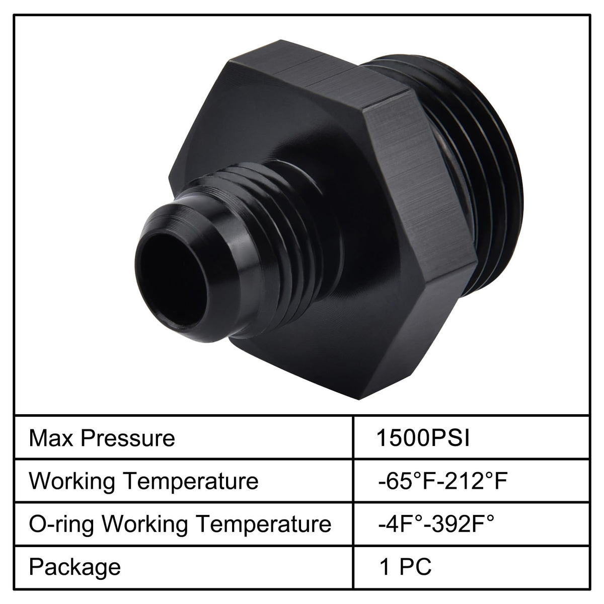 Q: What are the working pressure and temperature specifications for this fitting?A: The working pressure for this fitting is 1500 PSI, with a working temperature range of -65°F to 252°F and an O-ring temperature range of -4°F to 392°F.
