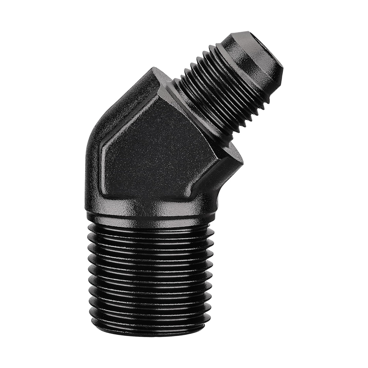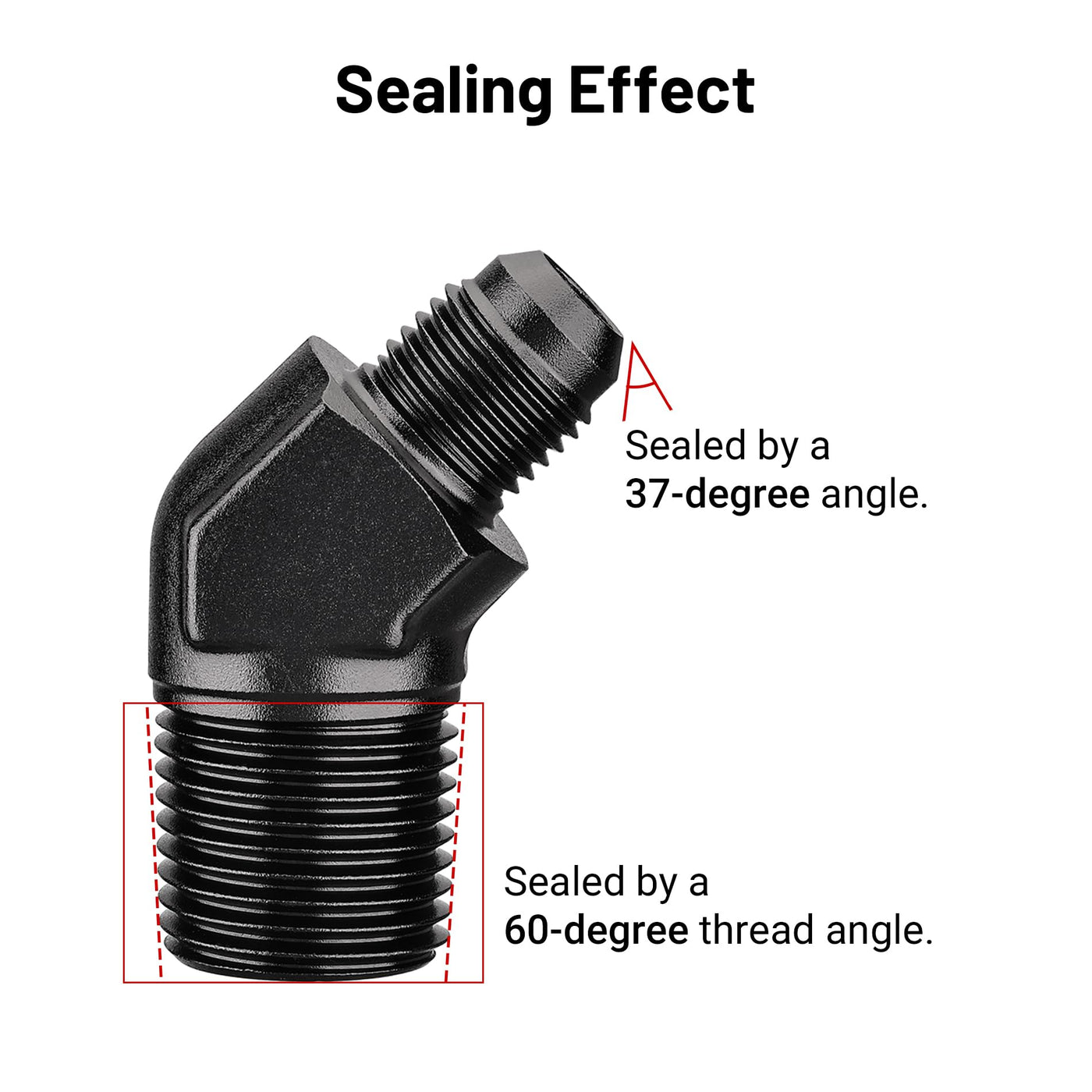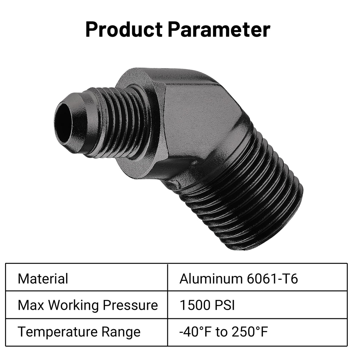 Size: 1/2'' NPT to AN6, the thread size of 6AN is 9/16-18 UNF, Degree: 45 degree elbow | Material: Made of aluminum alloy 6061-T6, anodized black surface | Sealing: The AN side of the flare is sealed by a 37 degree angle and the NPT thread side is sealed by a 60 degree tapered thread | Application: Widely used in fuel system, cooling system, power steering system, etc | Notice: To ensure no leakage at the NPT end, sealant or PTFE tape is strongly recommended. Recommended to use a wrench for installation and removal, 5-10 seconds to complete installation