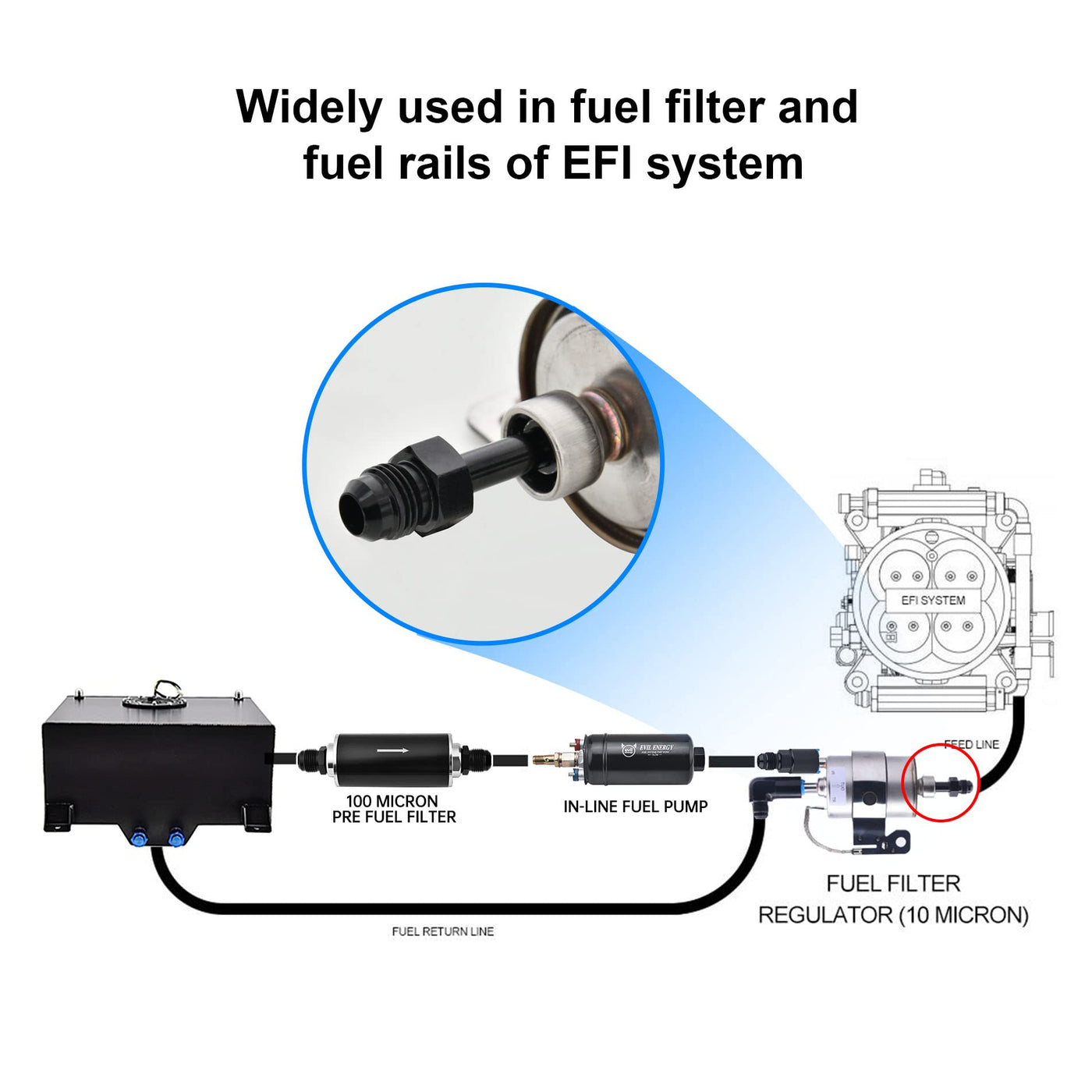 Q: How does the sealing mechanism work in this fitting?A: The 6AN flare EFI fitting is sealed at a 37-degree angle, which helps to prevent leakage and ensures a tight fit when connected to compatible fuel lines, providing a secure and reliable connection.