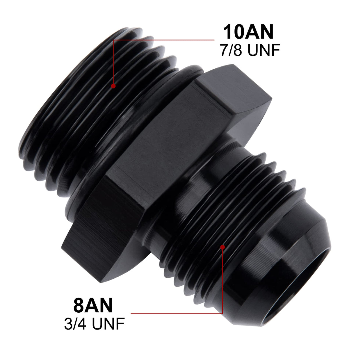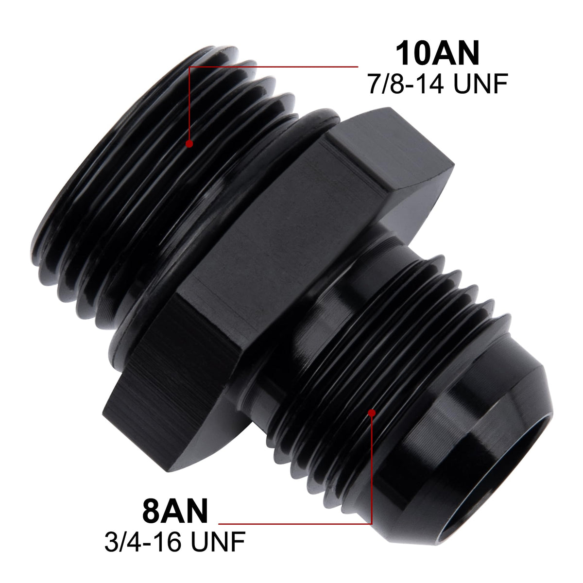 Q: What are the thread sizes for the EVIL ENERGY 8AN to AN10 ORB fitting adapter?A: The thread size of the 8AN flare is 3/4-16 UNF, while the thread size of the AN10 ORB is 7/8-14 UNF.