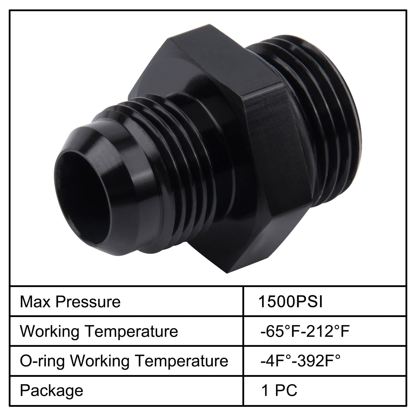 Q: What is the working pressure and temperature range for this fitting?A: The working pressure for the EVIL ENERGY fitting adapter is up to 1500PSI. It can operate within a temperature range of -65°F to 252°F, while the O-ring has a temperature range of -4°F to 392°F.