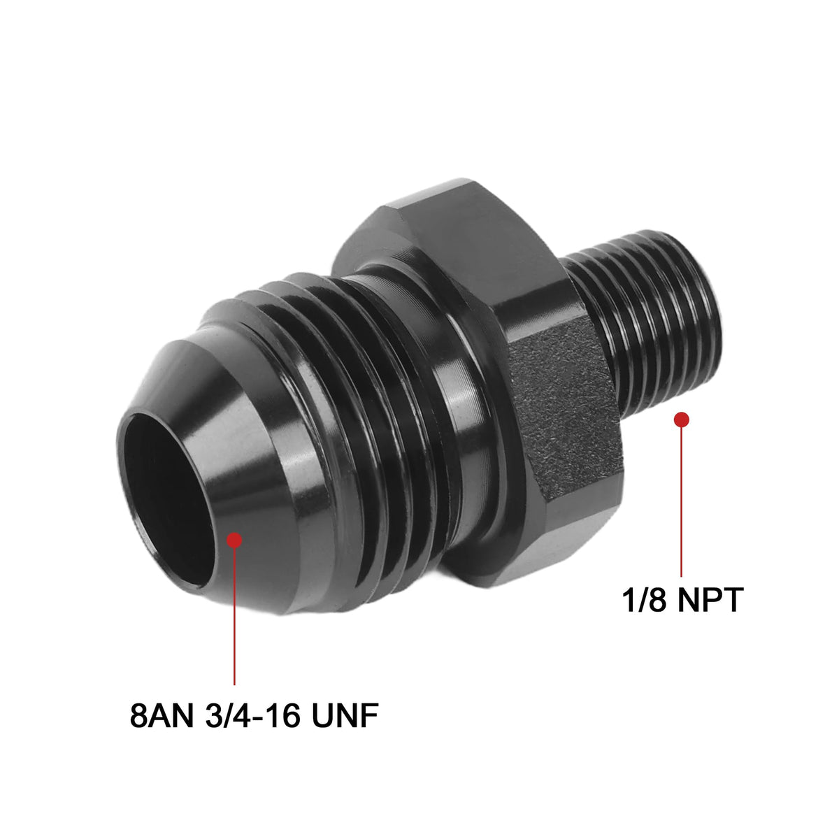 [Size] AN8 to 1/8'' pipe, the thread size of 8AN is 3/4-16 UNF. | [Material] Made of aluminum alloy 6061-T6, anodized black surface, bright appearance, anti-corrosion. | [Sealing] The AN side of the flare is sealed by a 37 degree angle and the NPT thread side is sealed by a 60 degree tapered thread. | [Application] Widely used in fuel system, cooling system, power steering system, etc. | [Notice] To ensure no leakage at the NPT end, sealant or PTFE tape is strongly recommended. Easy installation and removal with wrench.
