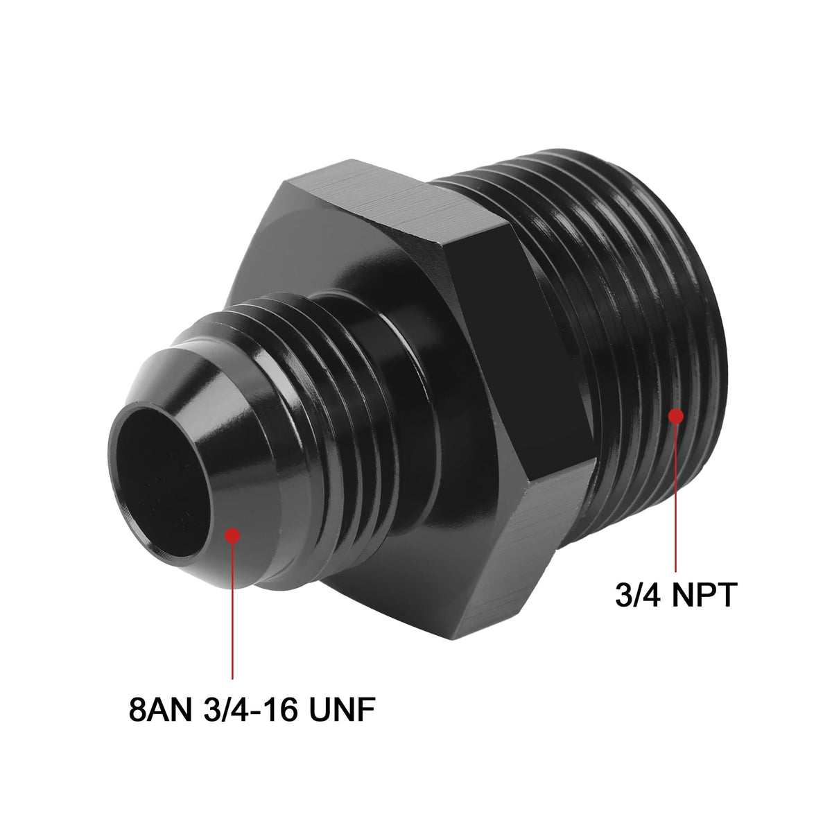 [Size] AN8 to 3/4'' pipe, the thread size of 8AN is 3/4-16 UNF. | [Material] Made of aluminum alloy 6061-T6, anodized black surface, bright appearance, anti-corrosion. | [Sealing] The AN side of the flare is sealed by a 37 degree angle and the NPT thread side is sealed by a 60 degree tapered thread. | [Application] Widely used in fuel system, cooling system, power steering system, etc. | [Notice] To ensure no leakage at the NPT end, sealant or PTFE tape is strongly recommended. Easy installation and removal with wrench.