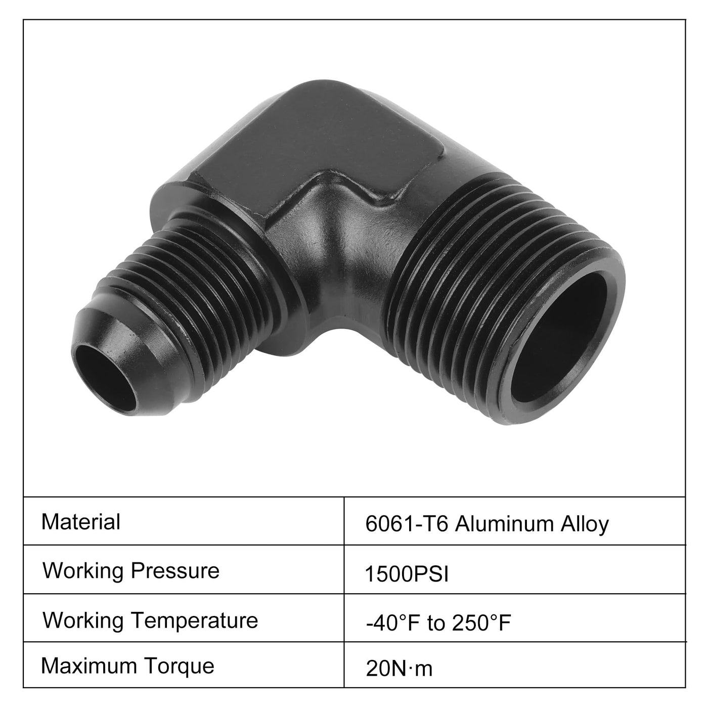 [Size] AN8 to 3/4'' pipe, the thread size of 8AN is 3/4-16 UNF, Degree: 90 degree elbow | [Material] Made of aluminum alloy 6061-T6, anodized black surface, bright appearance, anti-corrosion. | [Sealing] The AN side of the flare is sealed by a 37 degree angle and the NPT thread side is sealed by a 60 degree tapered thread. | [Application] Widely used in fuel system, cooling system, power steering system, etc. | [Notice] To ensure no leakage at the NPT end, sealant or PTFE tape is strongly recommended. Easy installation and removal with wrench.