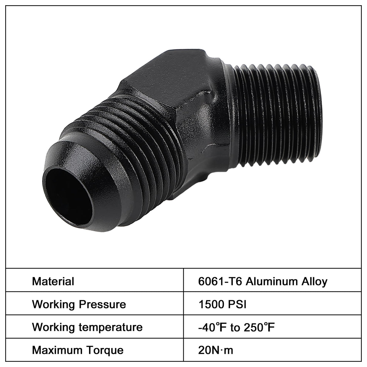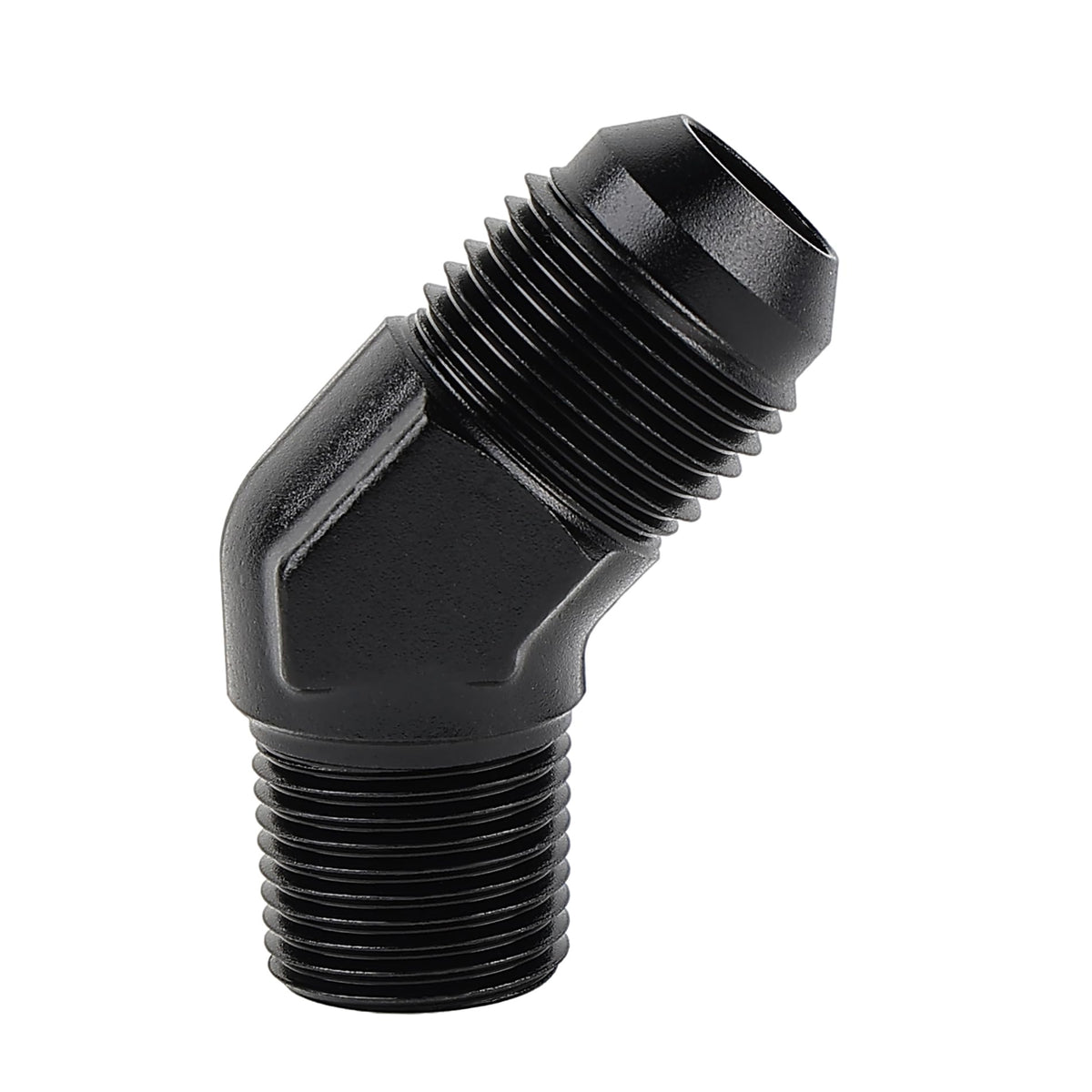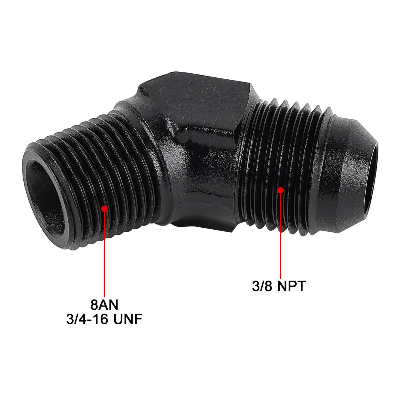 [Size] 3/8'' NPT to AN8, the thread size of 8AN is 3/4-16 UNF , Degree: 45 degree elbow. | [Material] Made of aluminum alloy 6061-T6, anodized black surface. | [Sealing] The AN side of the flare is sealed by a 37 degree angle and the NPT thread side is sealed by a 60 degree tapered thread. | [Application] Widely used in fuel system, cooling system, power steering system, etc. | [Notice] To ensure no leakage at the NPT end, sealant or PTFE tape is strongly recommended. Easy installation and removal with wrench.