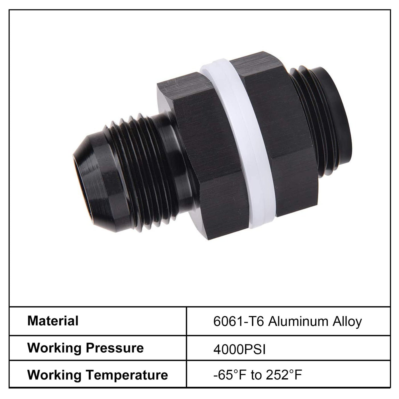 [Size] The thread size of 10an is 7/8-14 UNF. | [Parameter] Max Working Pressure: 4000PSI. Working Temperature Range: -65 ? to 252 ?. | [Material] Aluminum alloy 6061-T6, anodized black surface. | [Seal] The AN flare is sealed by a 37 degree angle. | [Application] Widely used in fuel systems, such as fuel hose extends, return line, fuel cell, firewall, etc.