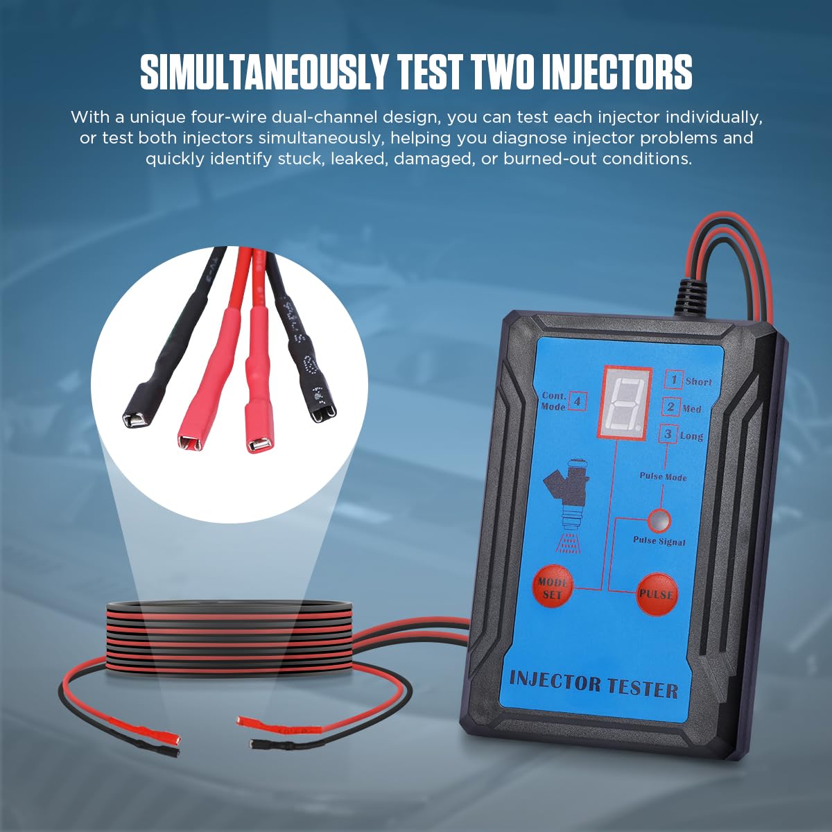 Q: Can I test multiple fuel injectors at the same time with this kit?A: Yes, the Fuel Injector Cleaner Kit has a unique four-wire dual-channel design that allows you to test two injectors simultaneously. This feature helps you quickly diagnose issues such as stuck, leaking, or burnt-out injectors.