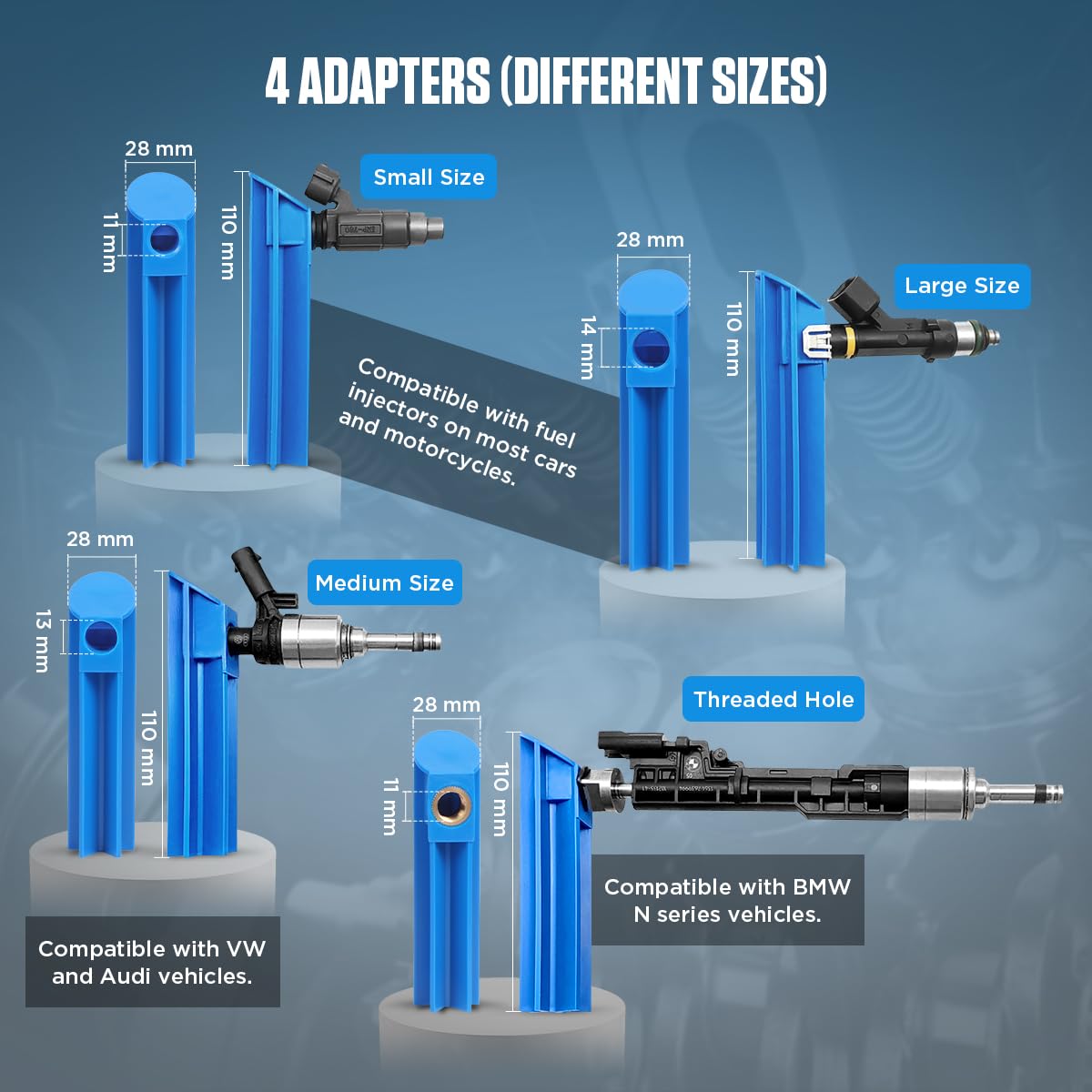 Q: What vehicles are compatible with the Fuel Injector Cleaner Kit?A: The Fuel Injector Cleaner Kit is designed to be compatible with fuel injectors of various vehicles, including BMW, VW, AUDI, most cars, motorcycles, electric vehicles, ATVs, and boats. It comes with four different-sized blue tube adapters to ensure a proper fit.