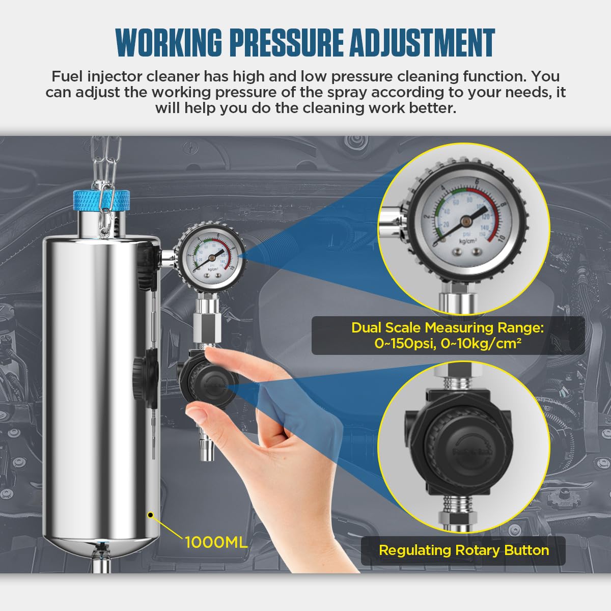 Q: How does the pressure adjustment feature work on this cleaner?A: This fuel injector cleaner kit features a high and low-pressure cleaning function. It includes a 1000ml tank and a dual scale pressure gauge that allows you to measure pressure from 0 to 150 PSI. The pressure can be adjusted easily using a rotary button, enabling you to customize the cleaning process according to your specific needs for optimal results.
