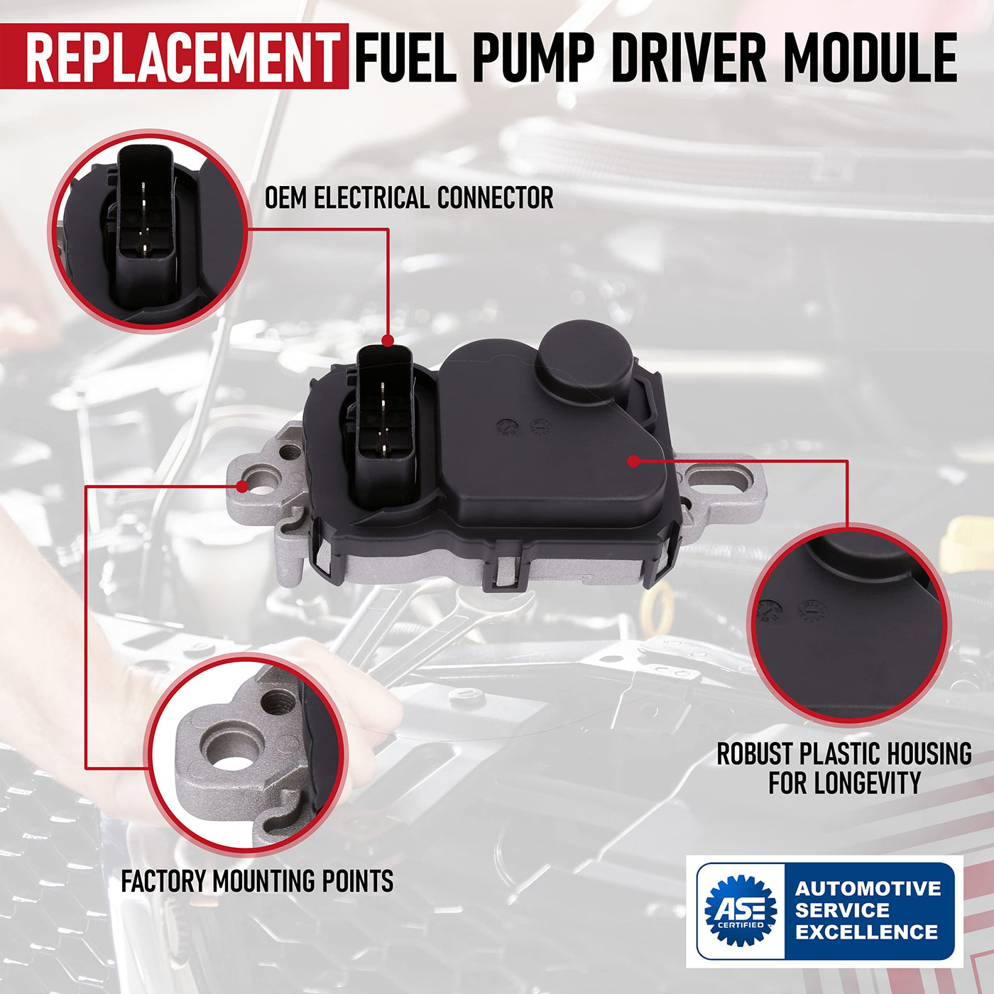 The fuel pump driver module or FPDM controls the voltage delivered to a vehicles fuel pump. By controlling the voltage, the module maintains optimal fuel pressure and delivery to the engine throughout its full operating range. Overheating, road vibrations, road debris and other contaminants can cause the unit to fail. Fits the following vehicles: 2006-2011 Crown Victoria 2004-2008 E-150 2004-2005 E-150 Club Wagon 2004-2008 E-250 2004-2005 E-350 Club Wagon 5.4L 2005 Ford E-350 Club Wagon 6.8L 2004-2008 E-350 Super Duty 5.4L / 6.8L 2004-2008 E-450 Super Duty 6.8L 2005-2008 Escape 2005-2008 Expedition 5.4L 2006-2010 Explorer 2004-2010 Explorer Sport Trac 2004-2008 F-150 2005-2010 F-250 Super Duty 5.4L / 6.8L 2005-2010 F-350 Super Duty 5.4L / 6.8L 2005-2010 F-450 Super Duty 6.8L 2005-2010 F-550 Super Duty 6.8L 2004-2009 F53 6.8L 2005-2006 GT 2005-2006 Mustang 2007-2010 Mustang 4.0L/4.6L/5.4L 2006-2008 Mark LT 2005 Navigator 2006-2008 Navigator 5.4L 2006-2011 Town Car 2005-2008 Tribute 2.3L 2005-2011 Tribute 3.0L 2006-2011 Grand Marquis 2005-2008 Mariner 2006-2010 Mountaineer Replaces part numbers: 590-001, 6H1470, 6H1471, 4C2A-9D372-BA, 5L8A9D370AA. This is a compatible replacement part manufactured by AA Ignition. This fuel pump driver module is NOT a genuine OEM part. Vehicle makes and their associated vehicle models and part numbers are used in this listing only to identify the vehicles this fuel pump driver module fits.
