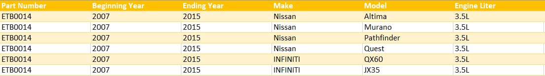 Q: What vehicles are compatible with the Hitachi ETB0014 Fuel Injection Throttle Body?A: The Hitachi ETB0014 is compatible with several vehicles from 2007 to 2015, including INFINITI models such as QX60 and JX35, as well as Nissan Altima, Murano, Pathfinder, and Quest, all equipped with a 3.5L engine.