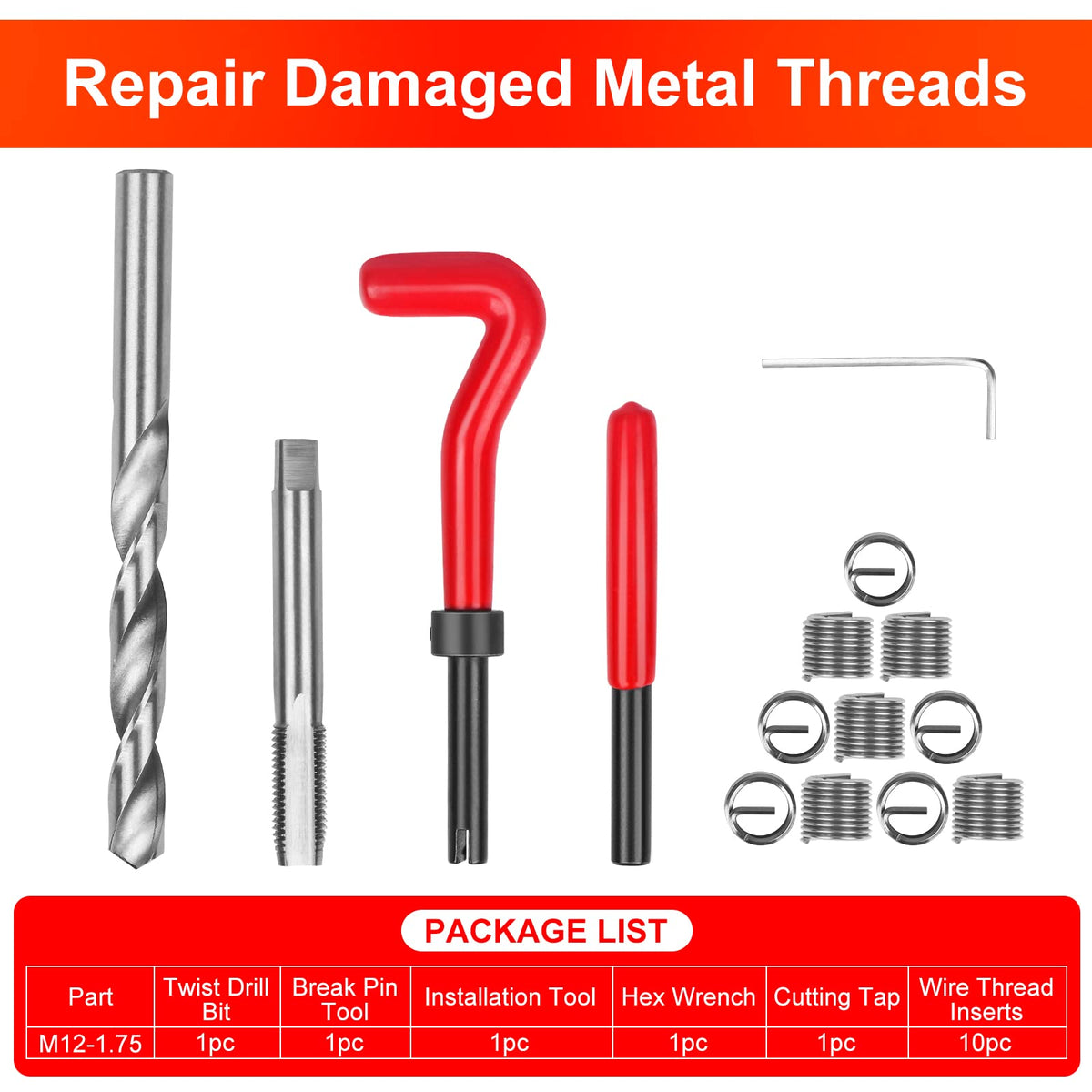 Jmmrrr 15 Pcs Metric Thread Repair Insert Kit M12*1.75Mm Drill Bit Taps Tool Set For Internal Screw Holes Repairing(Red)