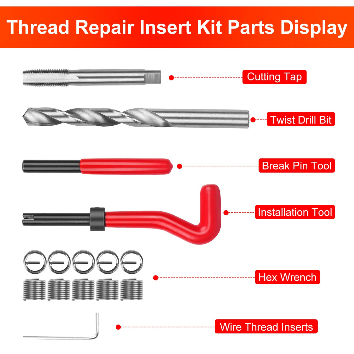 Why Choose Our 15 Pcs Thread Repair Tool Kit 15 Pcs Thread Repair Tool Kit, All Made According To Professional Standard, With A Storage Box, Each Accessory Has Its Place, For Easy Transport And Storage Between Jobs High-Quality Craftsmanship The Thread Repair Tool Kit Made From Precision Stainless Steel Wire For Strength And Durability, The Handle Is Made Of High-Quality Rubber, Ergonomically Designed, Non-Slip And Easy To Grip Widely Used This Thread Repair Kit Is For M12 To Repair Damaged Or Worn Out Threads, This Kit Helps Create A Stronger Internal Thread In Soft Metals And Protects Tapped Threads Against Wear And Damage, Ideal For Engine Repair And Other Automotive Applications