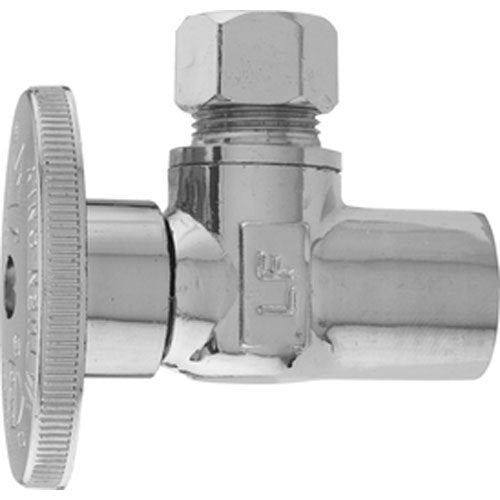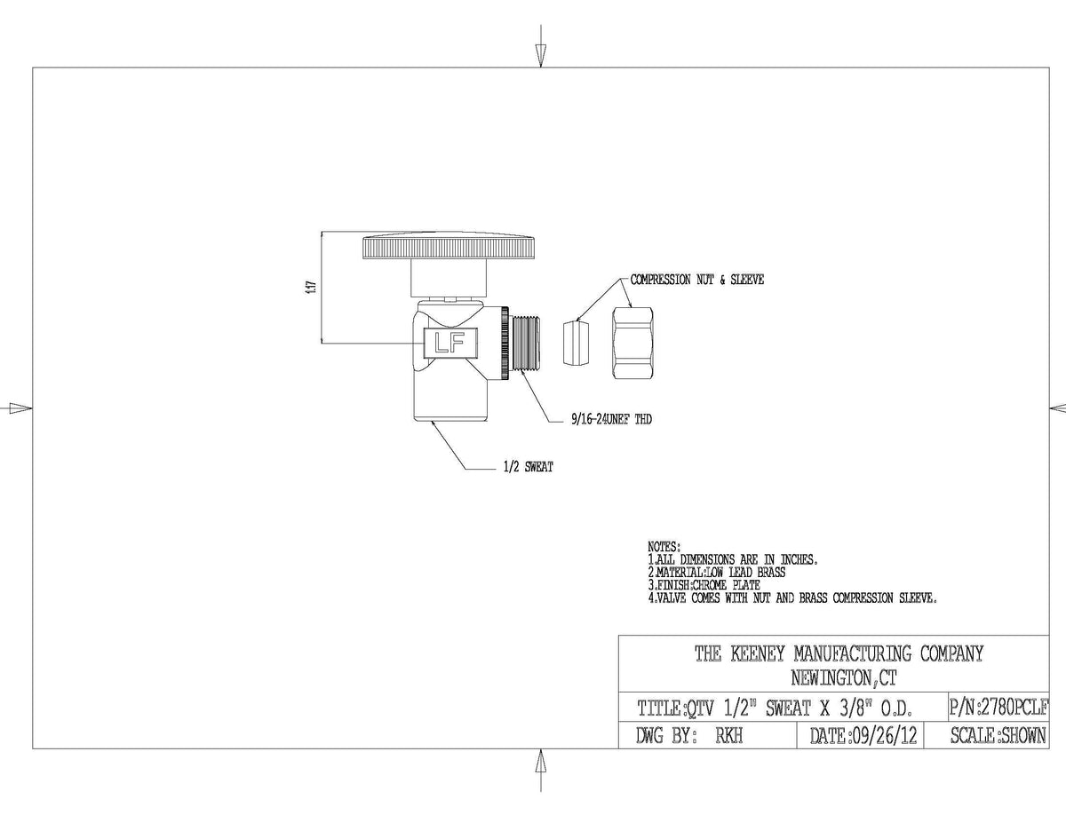 Product DescriptionKeeney 2780PCLF 1/2-Inch Copper Sweat by 3/8-Inch O.D. Quarter Turn Angle Valve, ChromeFrom the ManufacturerSolid brass chrome plated quarter turn angle valve. Inlet: 1/2-Inch copper sweat, Outlet: 3/8-Inch O.D. Lead Free: This product contains less than 0.25-percent weighted average lead content on wetted surfaces.