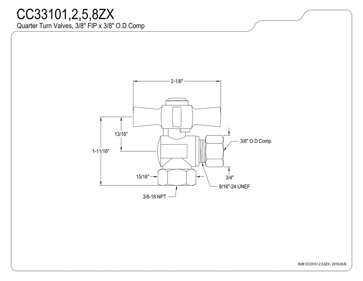 Q: What size connections does the KINGSTON BRASS CC33108ZX Angle Stop Valve support?A: The KINGSTON BRASS CC33108ZX Angle Stop Valve features a 3/8" FIP connection for the inlet and a 3/8" O.D. compression outlet, making it compatible with standard plumbing fixtures.