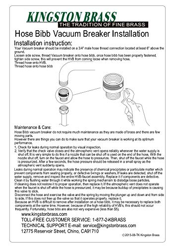 Q: Is the Kingston Brass Hose Bibb Vacuum Breaker compatible with all hose sizes?A: This vacuum breaker comes with a 3/4" FNH x MNH hose connection, making it compatible with standard garden hoses and hose thread faucets.