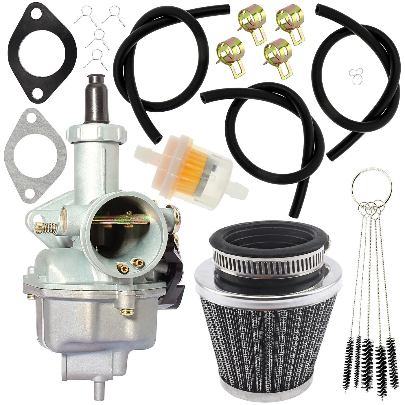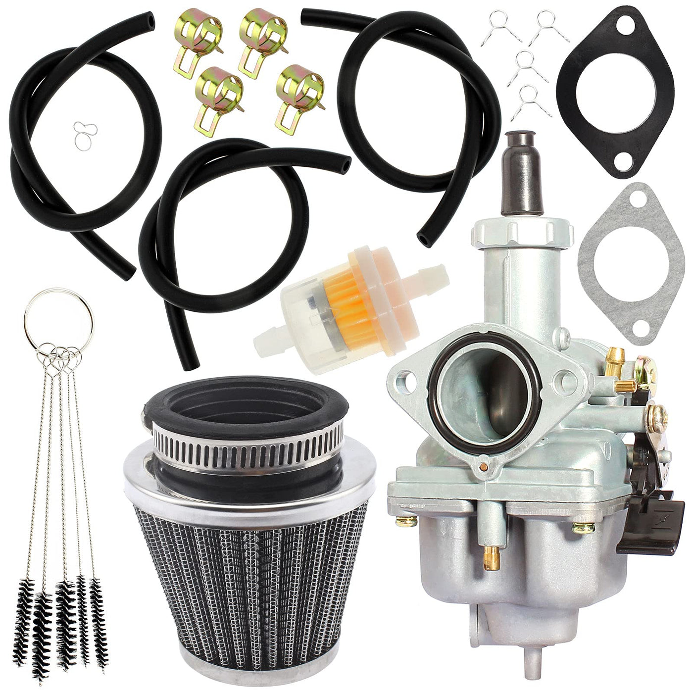 Specification: 100% brand new and high-quality carburetor and Filter kit. Color: silver. Fits most 100cc - 110cc, 125cc, 140cc, 150cc 4-stroke engines. For GY6 150cc ATV, Quad, Go Kart, Buggy and Dirt bike etc. Compatible with ATC185 ATC185S ATC200 ATC200S ATC200X CB125 XL125S TRX250 TRX250EX Recon engines. Replacement for TaoTao DB17 Dirt Bikes. Manufactured to exact measurements to meet or exceed OEM specification. Fits most Chinese import Pit / Dirt bikes, almost all of the bike brands from China, such as Taotao, Buyang, Coolsort, Kazuma, SunL, Roketa, AIM-EX etc. Carburetor size: Bolt hole spacing: 48mm. Intake inside diameter: 26mm. Filter mount inside diameter: 35mm. Filter mount outside diameter: 38mm. Filter size: Inlet diameter: approx. 39mm / 1.5 inch. Size: approx. 80 x 68 x 68mm / 3.2 x 2.7 x 2.7inch. Package includes: 1 x carburetor PZ26. 1 x carburetor cleaning brush. 1 x Filter. 1 x fuel filter. 3 x fuel lines. 2 x mount gaskets. 8 x clamps.