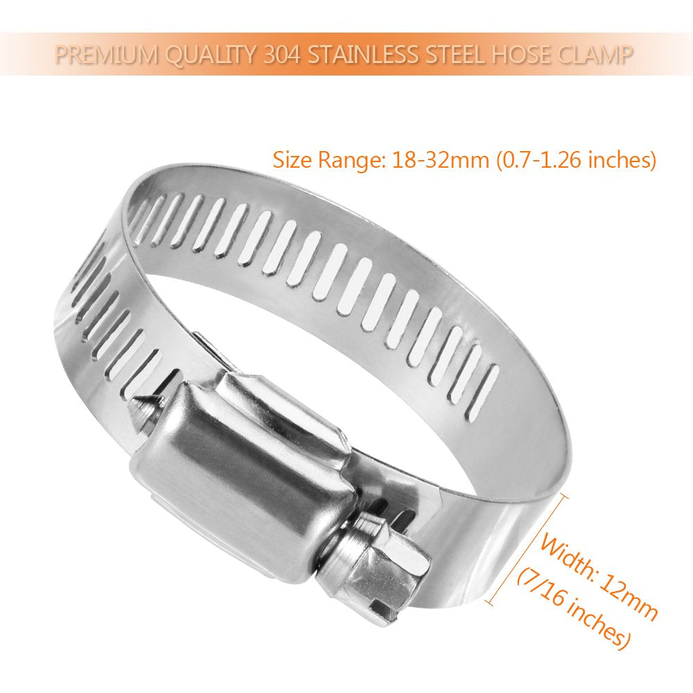 Specification: ? Material: Made of high quality stainless steel material. ? Hose clamp width: 7/16-inch ? Hose clamp size range: 18-32mm/0.7-1.26 inches.