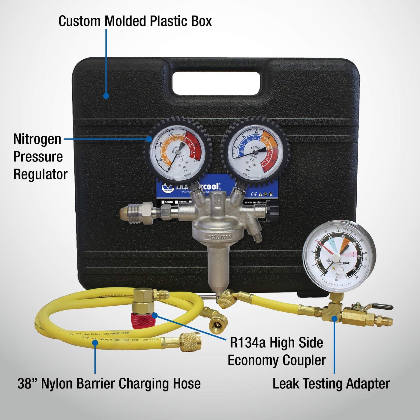 Mastercool’S Automotive Nitrogen Regulator Is Specifically Designed To Meet The Specifications Of Automotive A/C Systems. This Single Stage Nitrogen Regulator Is Used To Test Systems For Leaks When They Do Not Contain Refrigerant. This Unit Has A ¼” Sae Flare Outlet Port, With Control Valve, To Keep Pressure On The Regulator At All Times. The Large “T” Handle Provides Easy Pressure Adjustment While The 2 ½” Gauges With Gauge Guards Are Extremely Easy To Read In Any Environment. This Kit Comes Packaged In A Blow Molded Case With A Nitrogen Pressure Regulator (Standard Cga580), 38” Yellow Charging Hose, Leak Testing Adapter And High Side R134A Economy Coupler.• 1/4” Sae Flare Outlet Port, With Control Valve, To Keep Pressure On The Regulator At All Times• T-Handle For Ease Of Pressure Adjustment• 63 Mm (2 1/2”) Gauges With Guards• High Pressure Gauge 4400 Psig (300 Bar)• Low Pressure Gauge 1000 Psig (70 Bar)Automotive Pressure Test Regulator Kit Includes Nitrogen Pressure Regulator (Standard Cga580) (Us), 48” Yellow Charging Hose, Leak Testing Adapter, High Side Standard R134A 1/4' Fl-M X 13Mm Economy Coupler, Blow Molded Case