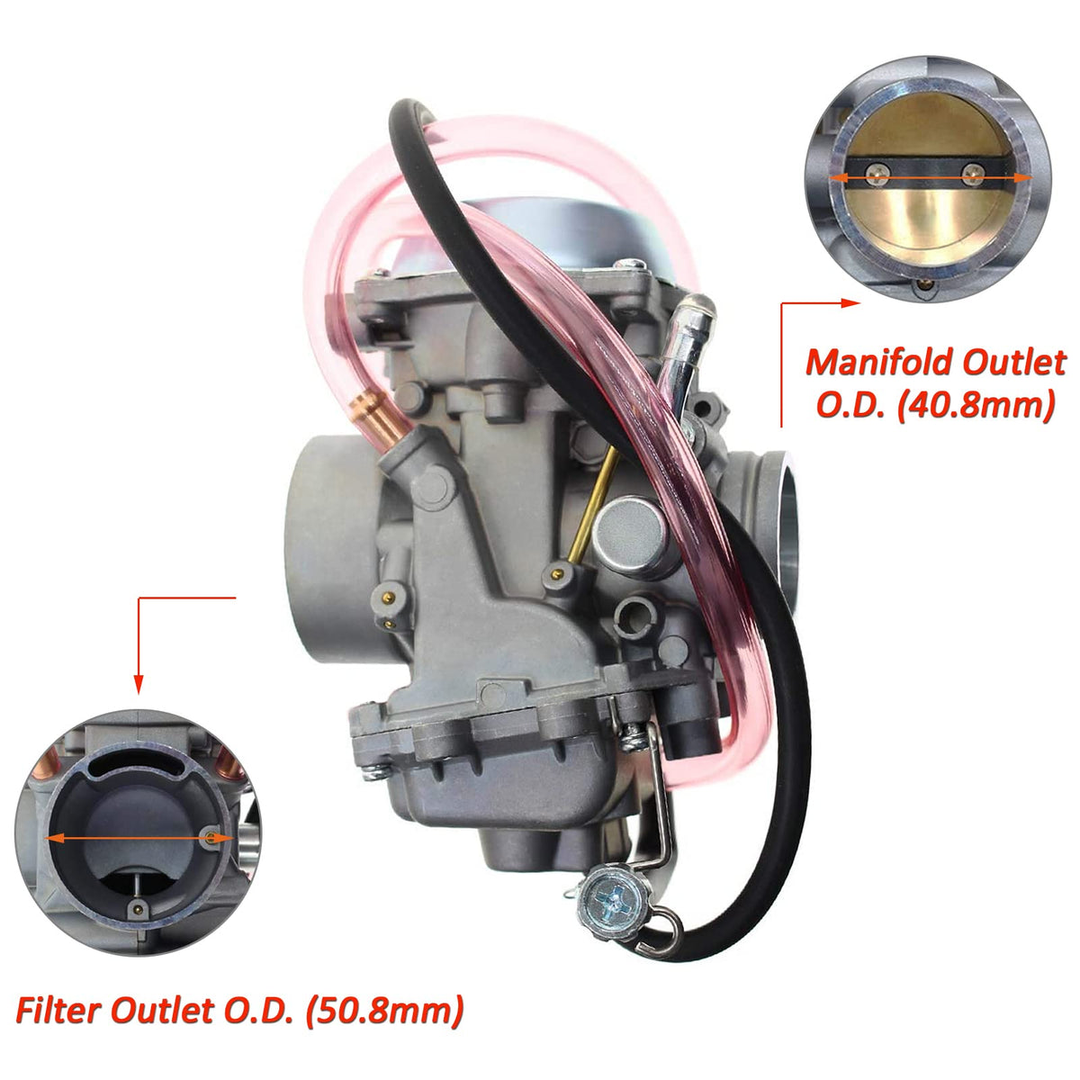 For Arctic Cat 250 300 400 500 Motorcarb Carburetor FITMENTNew carburetor fit for: For Arctic Cat 250, 1999/2000/2001 For Arctic Cat 300, 1998/1999/2000 For Arctic Cat 400 2x2 4x4, 1998 For Arctic Cat 400 2x4 4x4, 1999 For Arctic Cat 400 2x2 4x4 Green Red, 2000/2001 For Arctic Cat 500, 1998/1999Carb replacement of part numbers:0470-3480470-3520470-3620470-367FEATURE 100 Percent brand new and high-quality. All necessary carb internal parts are included and preset. Direct replacement; No/little adjustment needed. Making your old engine run like new:? Start right up? Idle properly? Accelerate properlyNOTICES1). Please check the appearance, model, year and part number to confirm suitability before purchase.2). Throttle cable: threaded typeIf your carb has a press-type throttle cable, not the common threaded type on the market, please drill the hole for throttle cable bigger for it to pass through.DIMENSIONOutlet Outer Diameter: 39.8mm; Inner Diameter: 34mmInlet Outer Diameter: 49.9mm; Inner Diameter: 45.9mmChoke Cable Hole Diam.: 12mmPACKAGE1x Carburetor1x Fuel filter1x Throttle base cover1x Throttle cable clip1x Throttle base gasket4x Base cover screws4x O-rings(As shown in pic.1)SHIPMENT1). Shipment request will be submitted to our US warehouse within 24 hours after you place an order.2). No loss to try: If incompatible, you could keep intact and return it freely within 30 days. and Customer Service90 days of . If there is any product problem, please do not hesitate to contact us. Your email will be replied within 24 hours.
