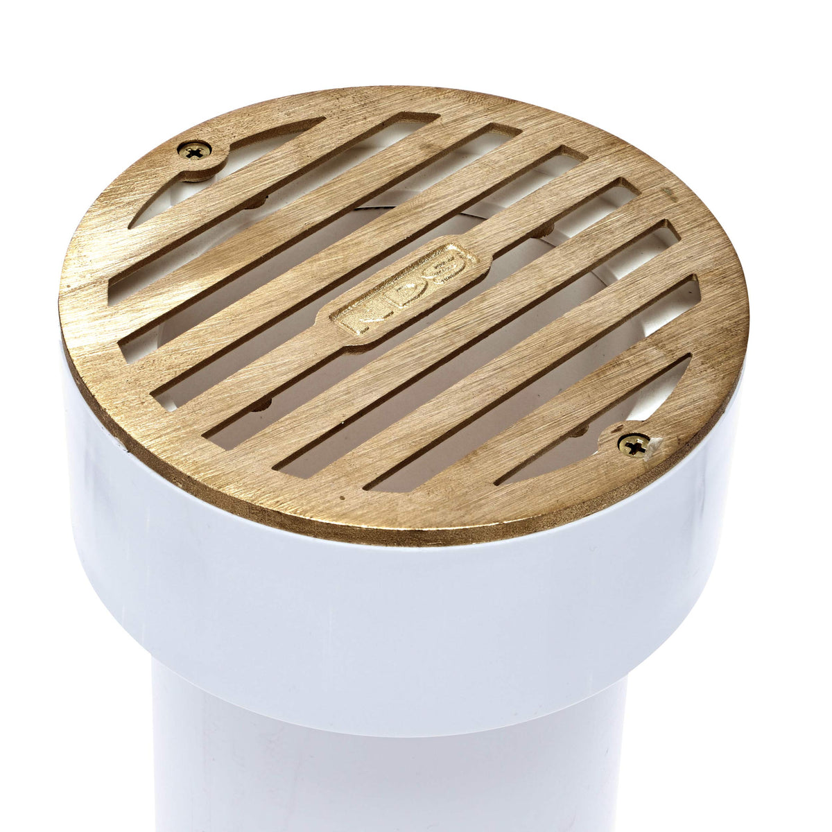 Strong and stylish, the brass 4 in. Round Drain Grate resists rust and corrosion with a lustrous look. The round drain grate, also known as a drain cover, is ideal for draining light flows of stormwater from small lawns, landscaped areas, patios, and walkways. Grate is made of solid brass and the collar is made of polyvinyl chloride, a type of plastic.The 4 in. Round Drain Grate has an open surface area of 5.3 sq. in. and flow rate of 16 GPM. Connects to 3 in. sewer and drain pipe and 4 in. sewer and drain fittings for a soil-tight fit. The pipe grate is ADA Compliant and heel-proof. The brass drain grate is built to stand up to the elements, and the PVC collar is made with a combination of virgin and recycled content treated with UV inhibitors to prevent fading and cracking from the sun. As part of a complete drainage system, the grate blocks leaves and debris as water enters drain pipes. The pipes carry the water to a discharge point downstream such as a pop-up emitter, or to percolate into the ground with a dry well or infiltration trench.NDS offers free tools such as the Home Drainage Center, Calculators, and NDS Stormwater Drainage mobile app to help make your project a success. Founded in 1972, NDS is the preferred choice of professionals and the leader in stormwater management solutions.