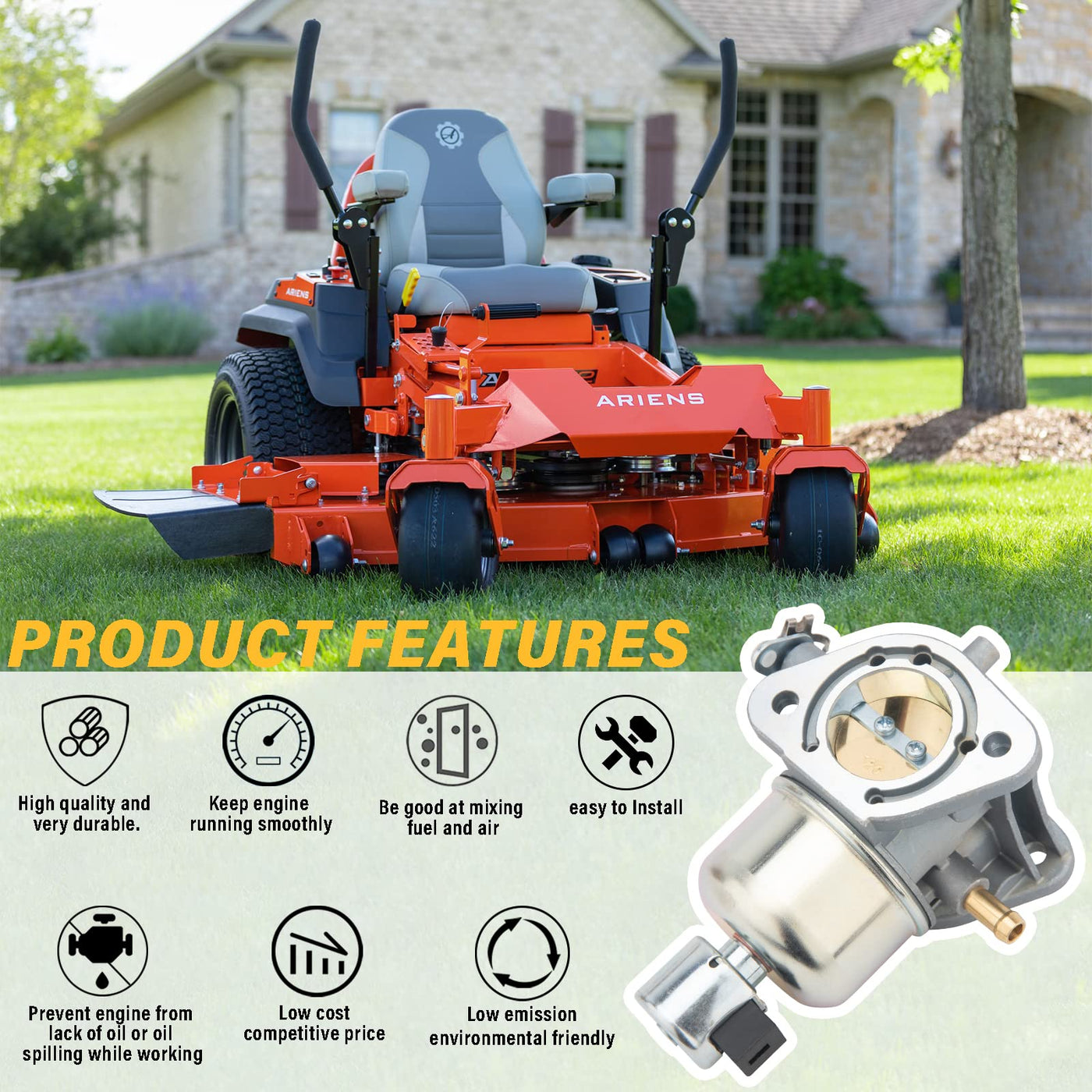 Q: What are the features of this new carburetor?A: This new carburetor features durable construction for reliable performance, a direct fit for original equipment, and includes one carburetor and a complete set of gaskets.