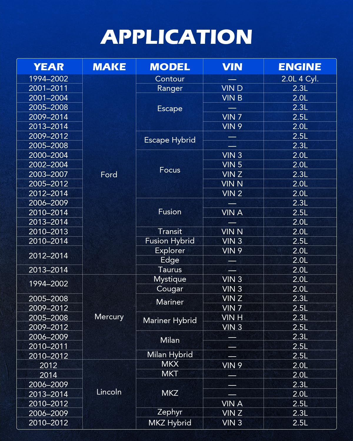 Together, this automotive tool kit lets you set the camshafts on 1994-2003 Ford Contours, Cougars, and Mystiques; 1994-2012 Ford Escapes, Focuses, and Rangers; 2004-2012 Ford Edges, Explorers, Fusions, Mariners, Milans, MKXs, MKZs, Transits, and Zephyrs; 2014 MKTs; as well as some Mercury and Mazda vehicles using the same engines. Check the detailed fitment information above to ensure it will work for your specific vehicle.