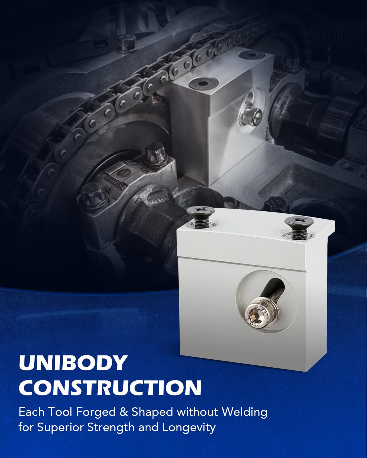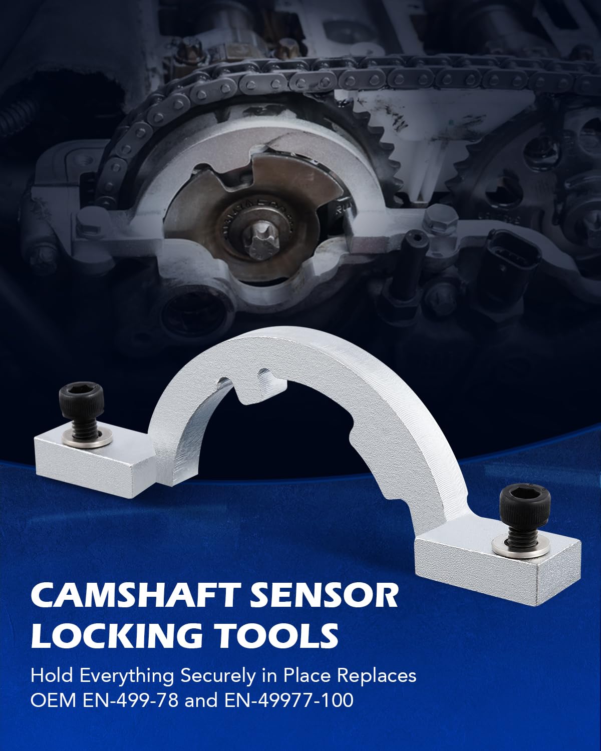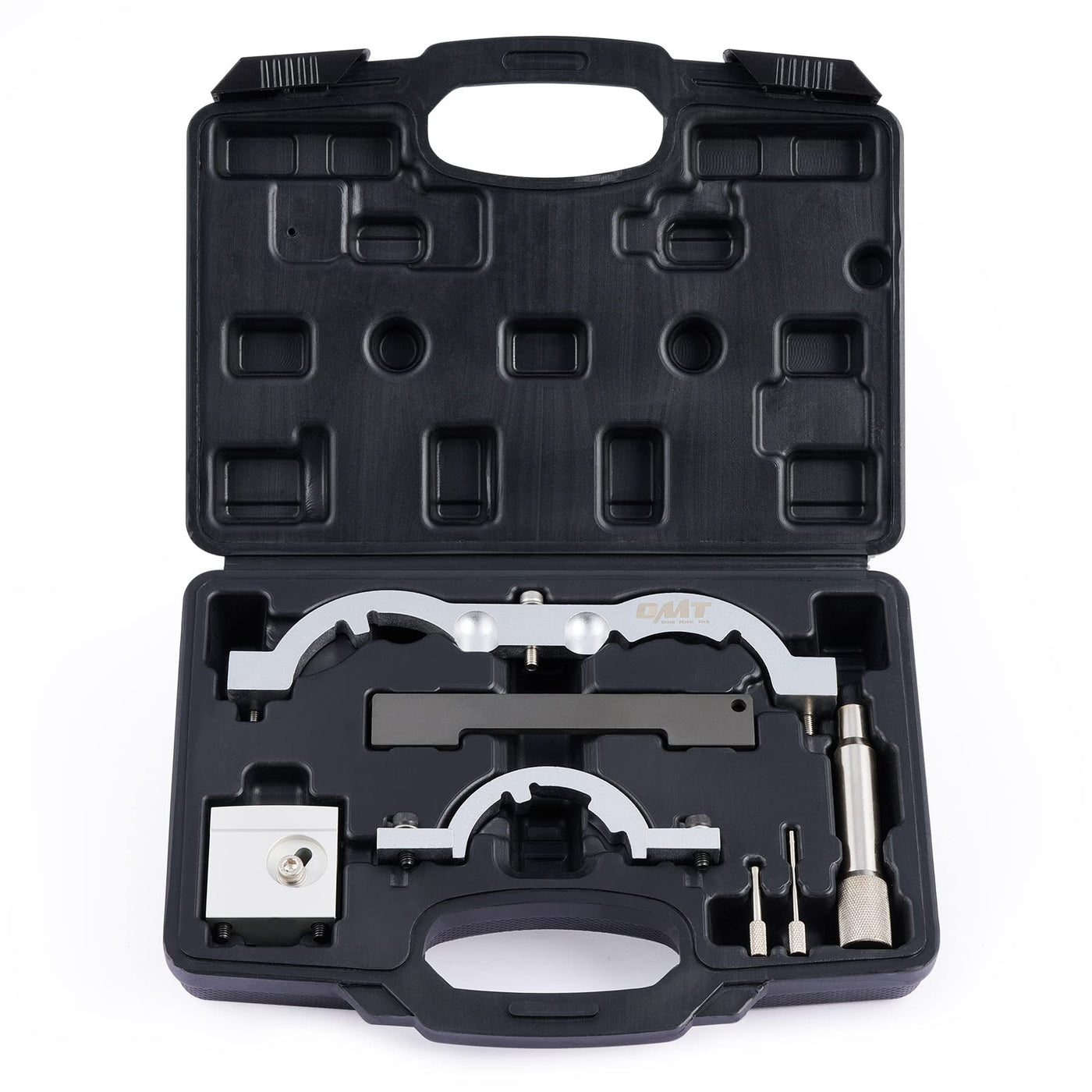 Q: How do I use the timing tool kit for my vehicle?A: To use the timing tool kit, first ensure your engine is off and cool. Follow the included instructions to use the camshaft locking plate and adjustment tools to hold your vehicle's timing system at top dead center, allowing you to check and replace any worn or damaged components effectively.