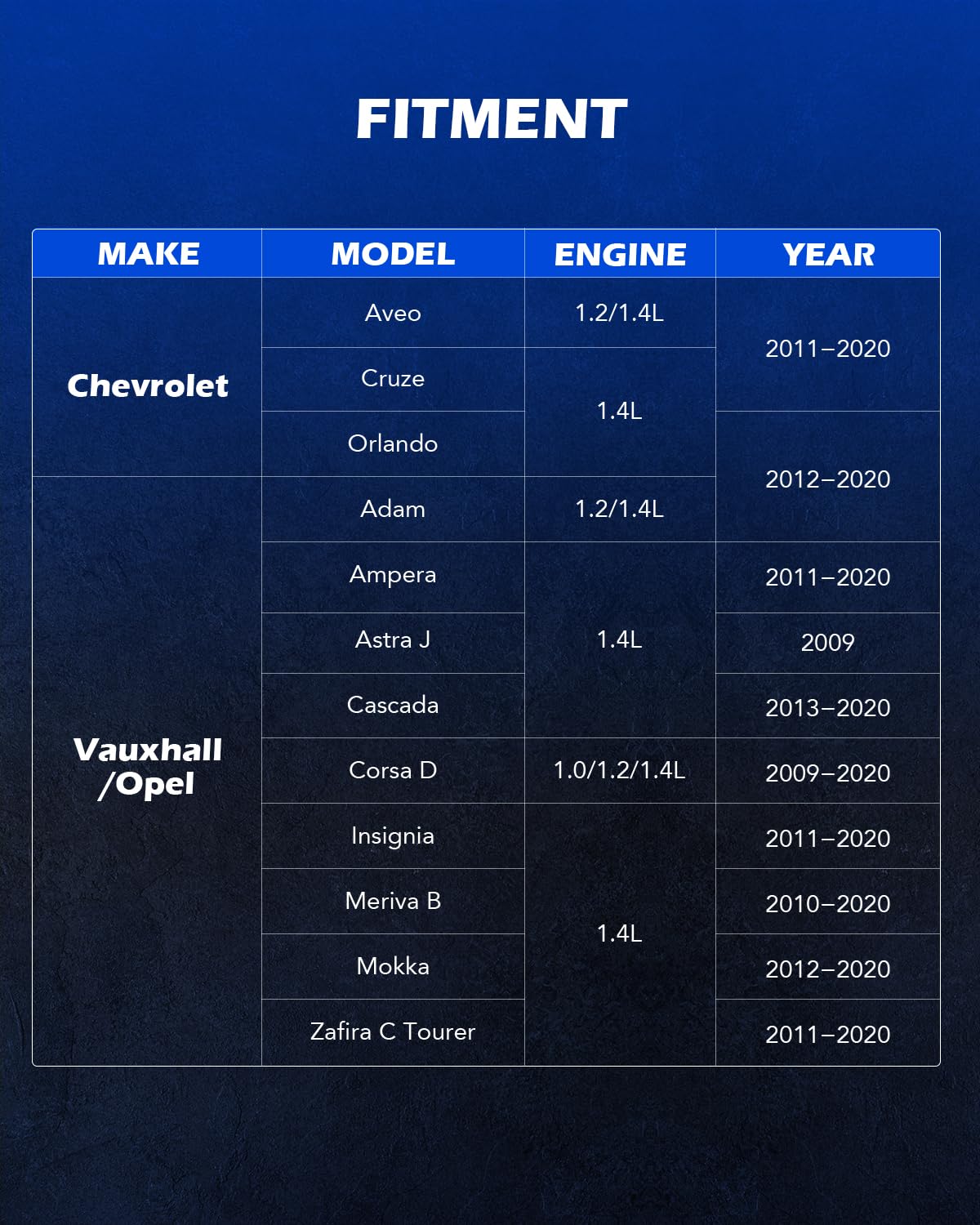 Q: What vehicles are compatible with the Orion Motor Tech Turbo Engine Timing Tool Kit?A: The Orion Motor Tech Turbo Engine Timing Tool Kit is compatible with a range of vehicles including 1.2L and 1.4L Chevrolet Aveos, Cruzes, and Orlandos, as well as 1.0L, 1.2L, and 1.4L Vauxhall and Opel models such as the Adam, Ampera, Corsa D, Cascada, Insignia, Meriva B, Mokka, and Zafira C Tourer.