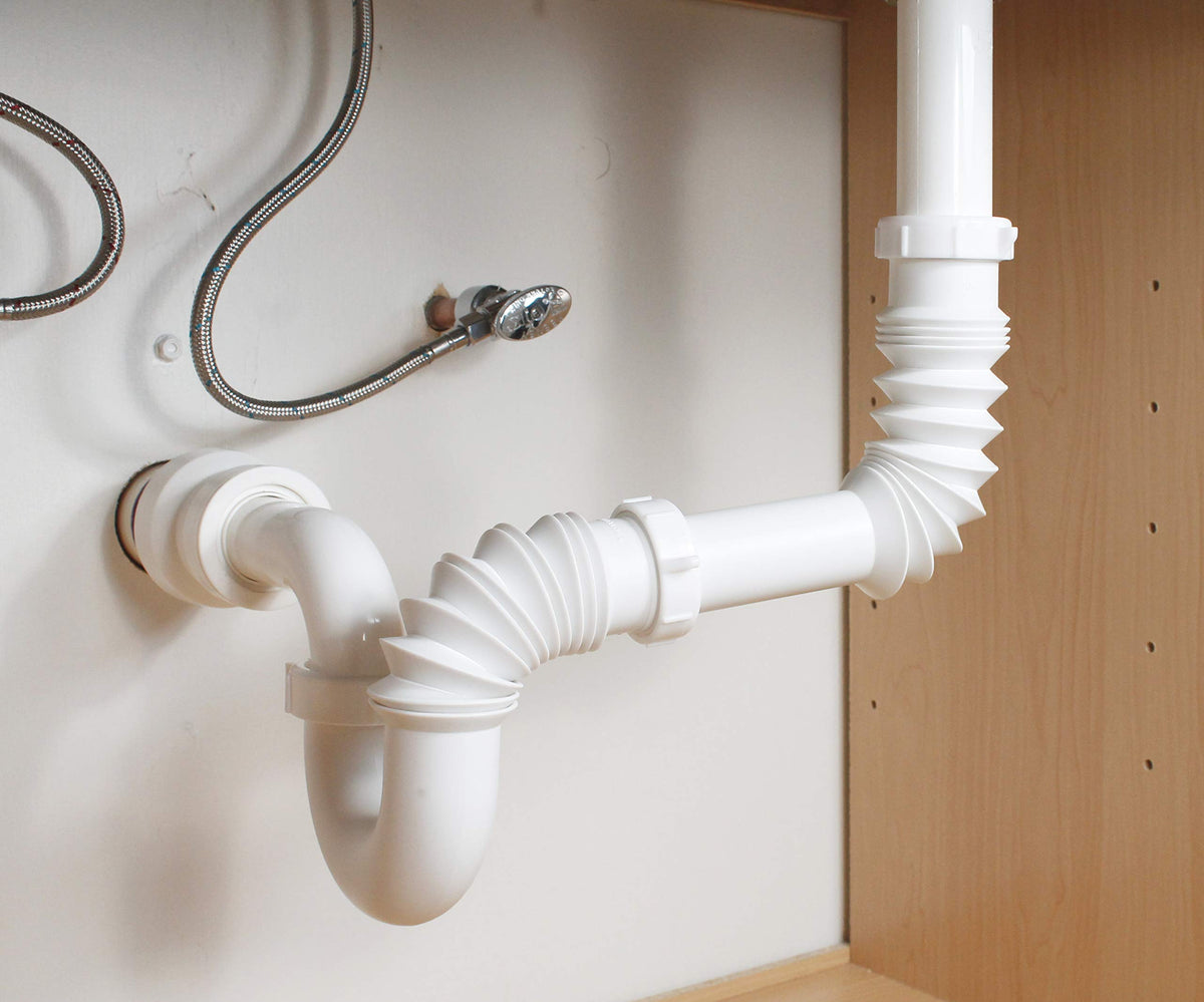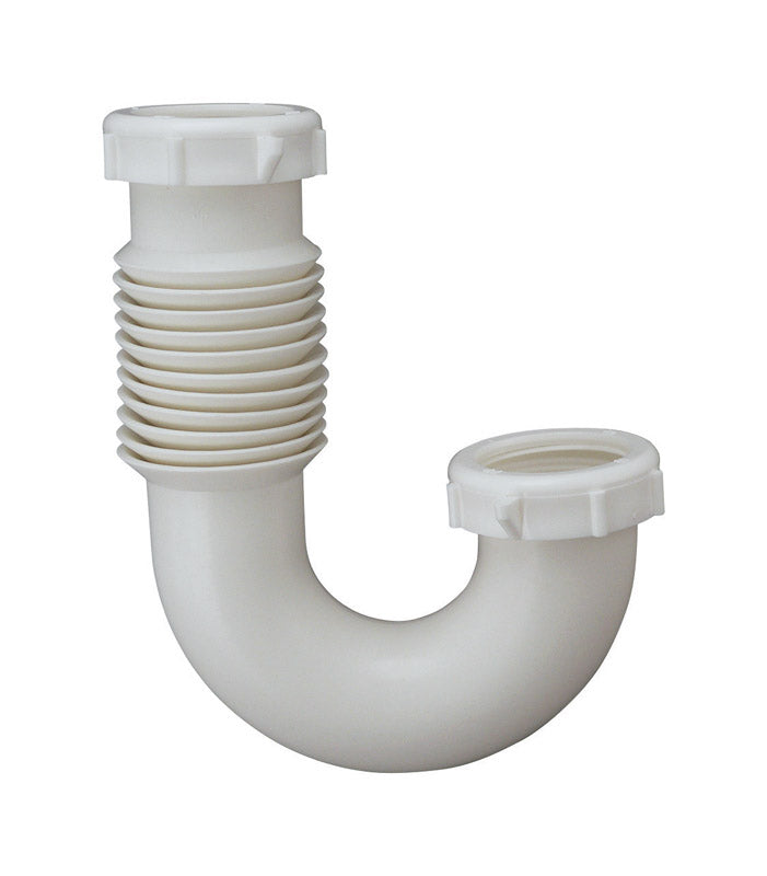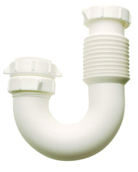 The Flex 'N Fix J bend with captured nut for IPS elbow has a 1-1/2' inlet and a reducing washer for a 1-1/4' inlet allowing for use in both the kitchen and bathroom. The J bend's flexible bellows allow for the part to extend between 7' and 11' with a 2-1/2' offset and can be repositioned and adjusted for unaligned plumbing connections. All necessary nuts and washers are included.