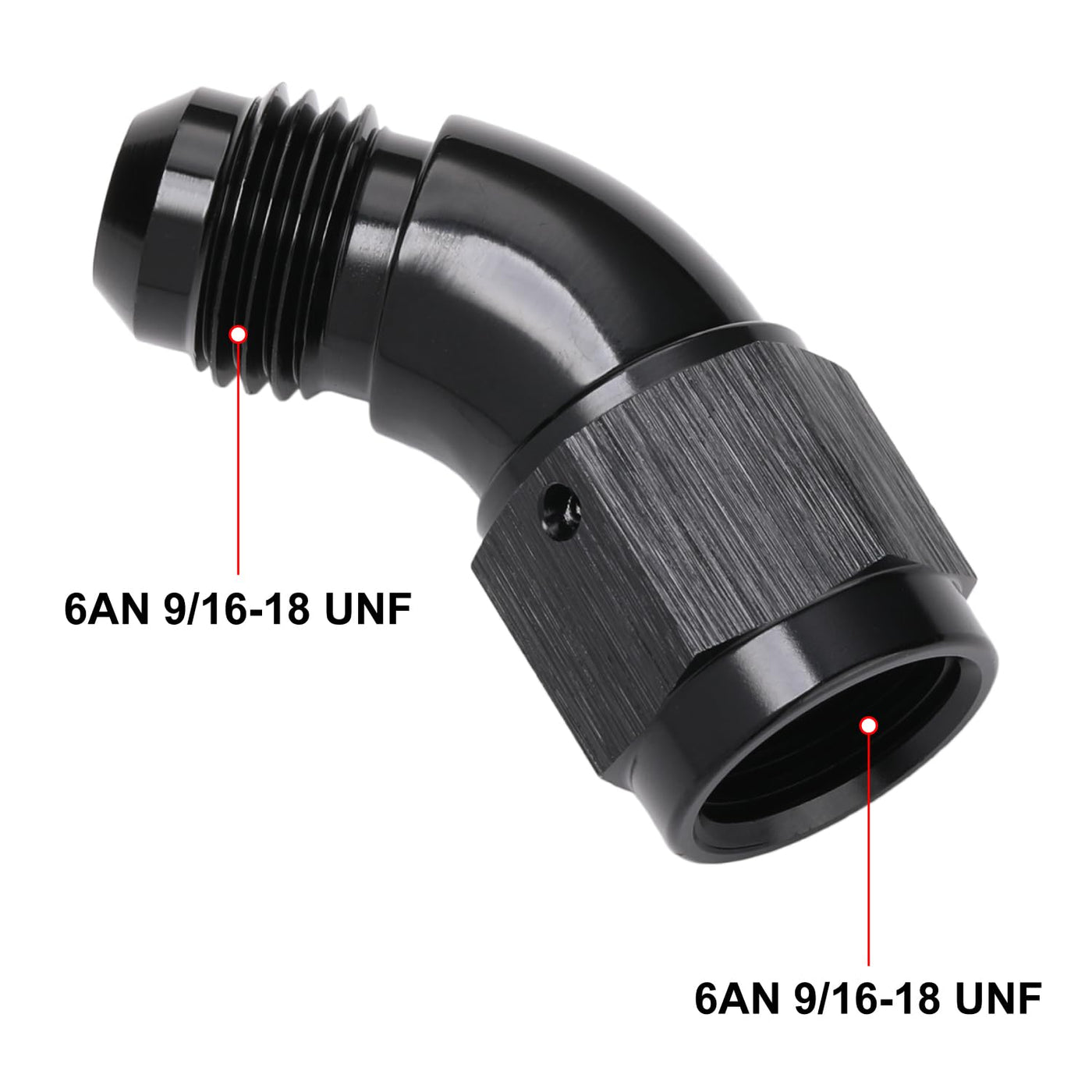 Specifications: Material: 6061 T6 billet Aluminum Size: 6AN (9/16x18 UNF) female swivel to male, 45 degree Surface Treatment: Anodized black Features: - 37 sealing angle guarantees a positive seal at maximum operating pressures - Universal fit for fuel, oil, diesel or water lines - The forged full flow construction has a superior wall thickness and provides an uninterrupted flow - All Podavelle fittings and adapters are fully compatible with gasoline and alcohol based fuels Notice: Professional installation is highly recommended! (No instructions included)
