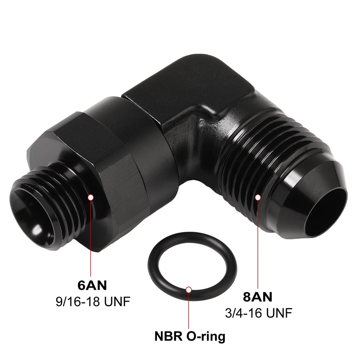 Podavelle 8An Male Flare To 6An -6 Orb O-Ring Boss 90 Degree Swivel Fitting Adapter Aluminum Black