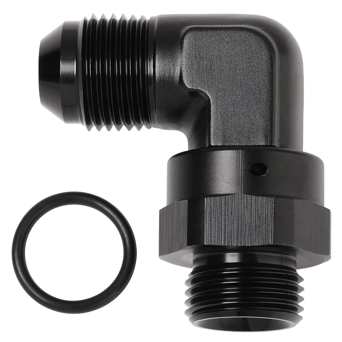 Specifications: Material: 6061 T6 Aluminum Thread Size: -8 AN male flare to -8 ORB O-ring, 90 degree Features: - Manufactured from lightweight 6061-T6 aluminum; Anodized finish for strength, durability and anti-corrosion - The low-profile design is perfect for applications with limited engine clearance - 360 full swivel head allows for easy installation and angle adjustment - Suitable for oil / fuel / coolant / water / air / gas, etc - All Podavelle fittings and adapters are fully compatible with gasoline and alcohol based fuels Notice: Professional installation is highly recommended! (No instructions included)