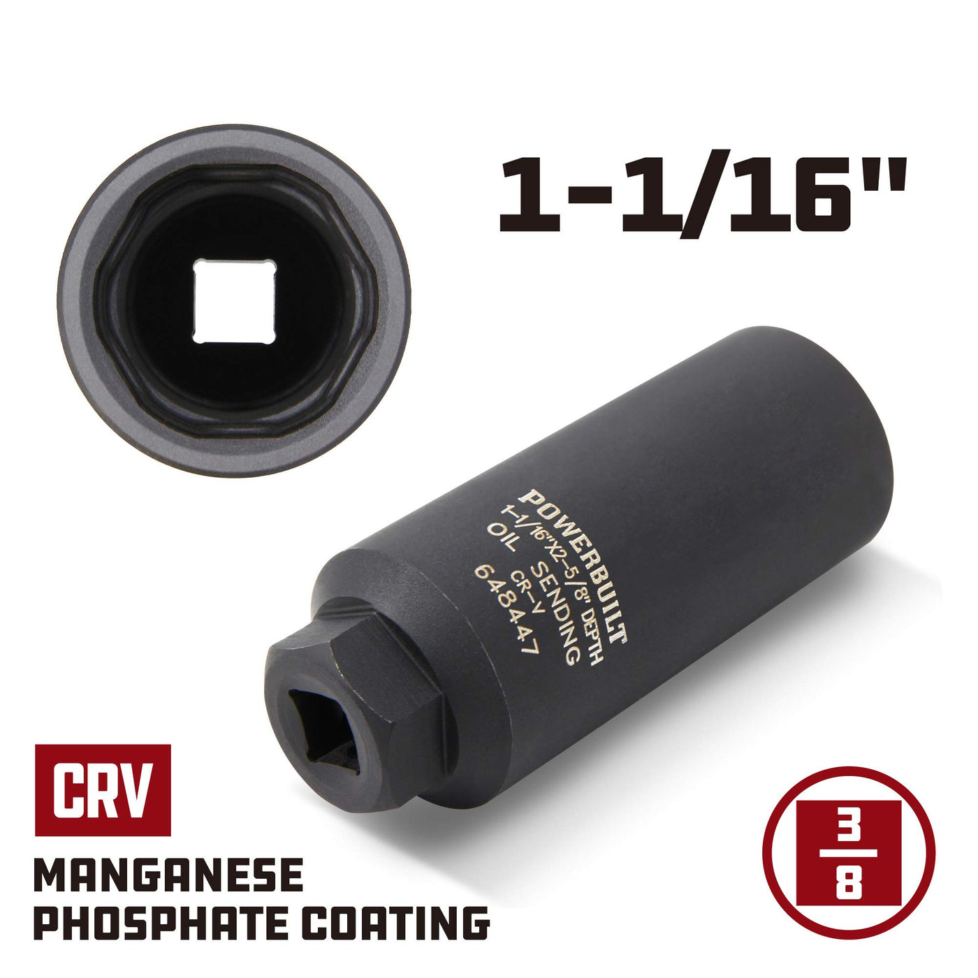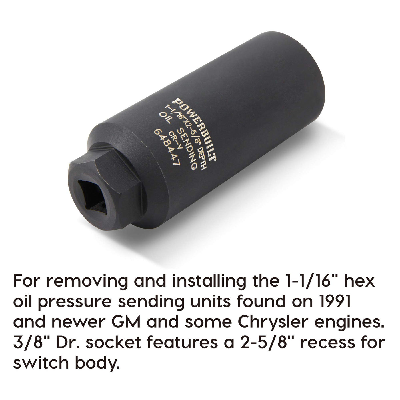 Q: What sizes of oil pressure sending units is this socket compatible with?A: The Powerbuilt 3/8-Inch Drive Oil Pressure Sending Socket is designed specifically for 1-1/16 inch hex oil pressure sending units, making it ideal for tasks involving these particular sizes.