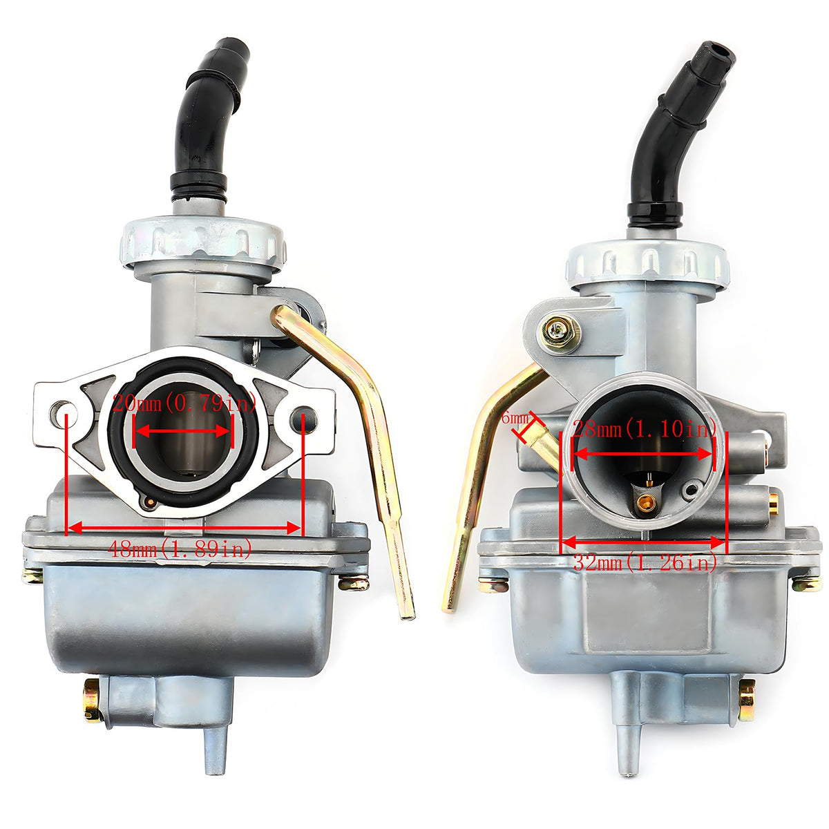 PZ20 Carburetor Compatible with TaoTao NST SunL Kazuma Baja 50cc 70cc 90cc 110cc 125cc ATV 4 Wheeler 4 Stroke Engine Go Kart Dirt Bike Quads and UTVs PZ20 Carburetor, For TaoTao NST SunL Kazuma Baja 50cc 70cc 90cc 110cc 125cc ATV Go kart. PZ20 Carburetor Fits Honda CRF50F 2004-2009 2011-2012, Honda CRF80F 2004-2009 2011-2013. Replacement of most Chinese brand carbs such as Taotao SunlRoketa Coolster, Taotao, Sunl, Roketa, Kazuma Buyang, Coolsport, Lifan, Kazuma, AIM-EX, SUNL, Honda, Redcat, Eagle; Go kart Moped Scooter Inner Diameter (intake side): 20mm Mounting Center to Center: 48mm Outer Diameter(air filter side): 32mm PZ20 Carburetor Rebuild Kit equipped with 35mm motorcycle conical air filter, double steel mesh design, suitable for most 35mm motorcycles. Carburetor for Dirt Bike ATVs, Quads, Go Carts, and UTVs CRF XR 4 stroke under 125CC ATVs Chinese ATVs, go karts with 4 stroke engine PZ20 Carburetor fit Models for Buyang, Coolsport, Lifan, Kazuma, SUNL, Honda, Redcat, Eagle; Go kart SUNL TAOTAO. Package includes: 1 x PZ20 carburetor 1 x air filter 1 x fuel filter 2 x gaskets Please check the dimensions of this carburetor, shown in the second and third pictures! Your old carburetor needs to look like the same with our pictures to replace it!