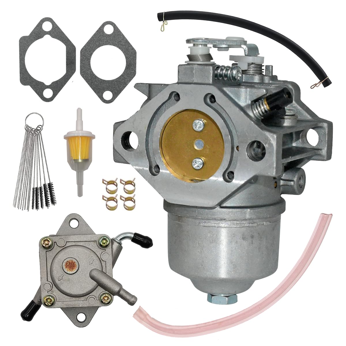Q: What does the package include with the Rebuiman AM122852 Carburetor?A: The package includes 1x Carburetor with Gaskets, 1x Fuel Line, 1x Fuel Filter, 1x Fuel Pump, 1x Cleaning Kit, and 4x Clamps, providing everything you need for installation and maintenance.