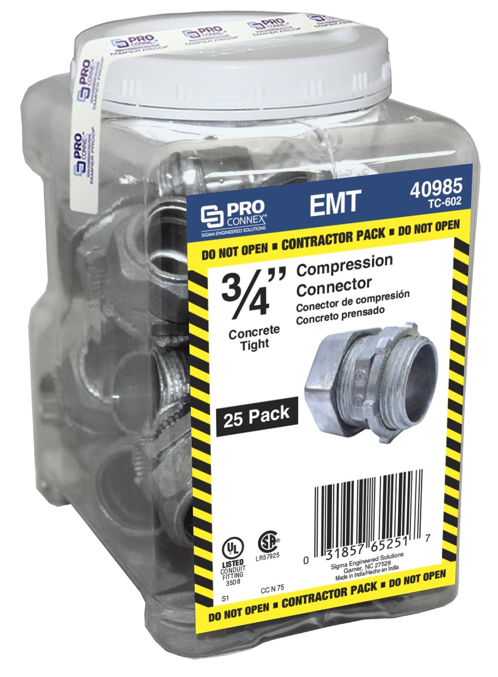 Q: How many connectors are included in a pack of the Sigma ProConnex TC-602?A: Each pack contains 25 Sigma ProConnex TC-602 EMT Compression Connectors, offering a convenient supply for various electrical projects.