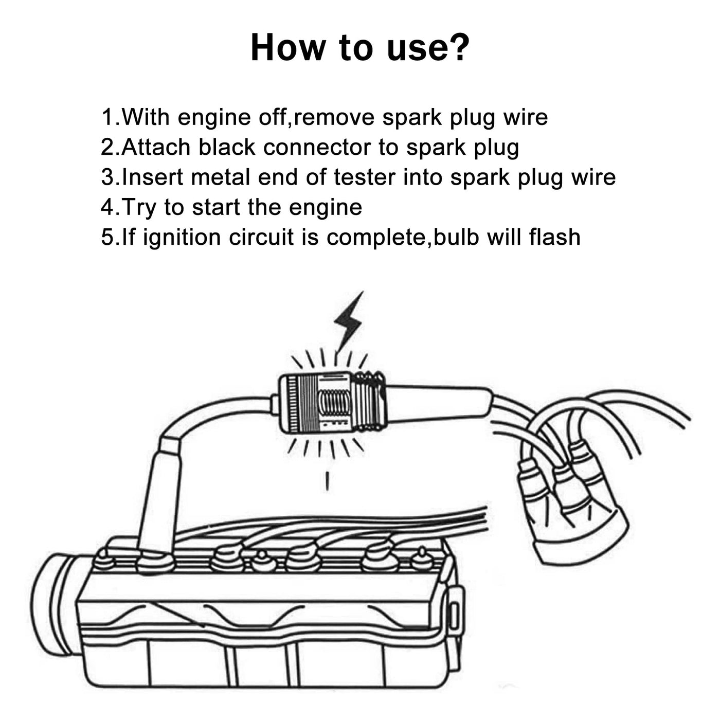 Q: How do I use the spark plug tester for troubleshooting?A: To use the SINGARO spark plug tester, simply connect it between the spark plug and the spark plug wire. Allow approximately 30 seconds for the internal combustion engine to troubleshoot. If the engine emits a spark, the tester bulb will light up, indicating the spark is functioning properly.