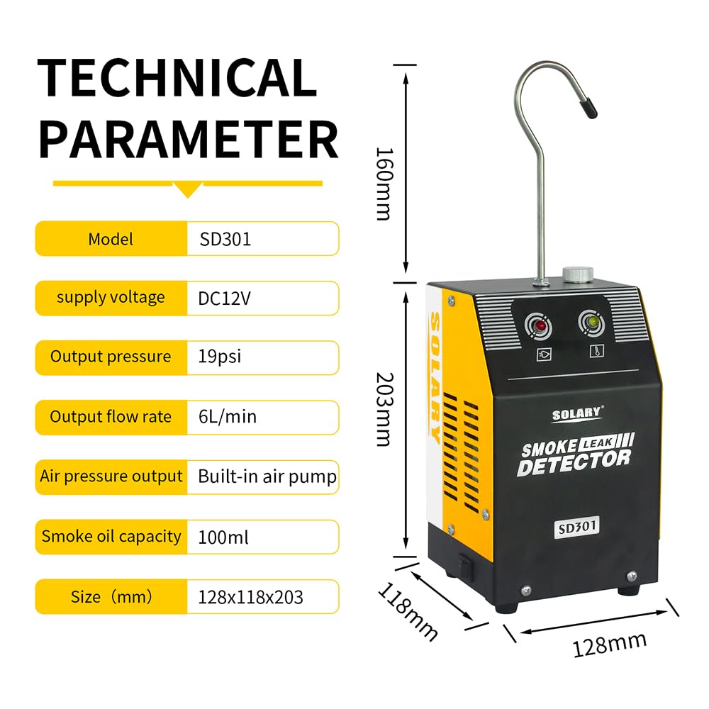 When Your Car Has Poor Airtightness, It Is Unable To Keep Warm, Dusty, Not Soundproof, And Not Waterproof; When The Air Intake System Leaks And Causes Insufficient Air Intake Of The Car Engine; When Improper Installation Causes Gaps In The Fuel Tank And Pipeline, And The Fuel Tank System Leaks. Don'T Worry, Our Car Smoke Leak Detector Will Help You Find Problems And Solve Them Quickly! Operation Steps: 1. Pour 20Ml Of Baby Oil Or Mineral Oil Into The Car Smoke Detector 2. Use The Hook To Hang The Smoke Leak Detector Machine On The Car 3. Disconnect The Pipe That Needs To Be Connected Detector 4. Connect The Detector The Dc 12V Battery And The Device Starts Working 5. The Pipes Will Be Filled With Smoke, Check For Leaks What'S In The Package? 1 X Sd301 Automotive Smoke Machine 1 X Rubber Connector 1 X Evap Dedicated Connector 1 X Power Cord Clip 1 X Standard Cone Adapter 1 X Valve Core Wrench 1 X Smoke Hose 1 X Hook 1 Set Soft Rubber Hose Plug Nota: 1. After Long-Term Use, The Smoke Oil Will Oxidize And Deteriorate, And At The Same Time, It Will Affect The Working State And Life Of The Relevant Parts Of The Instrument. Therefore, Please Replace The Smoke Oil In Time. 2. Before Adding New Smoke Oil, Pour Out All The Old Smoke Oil. 3. When Using, If The Smoke Has Water Droplets, Please Replace It With A New Smoke Oil