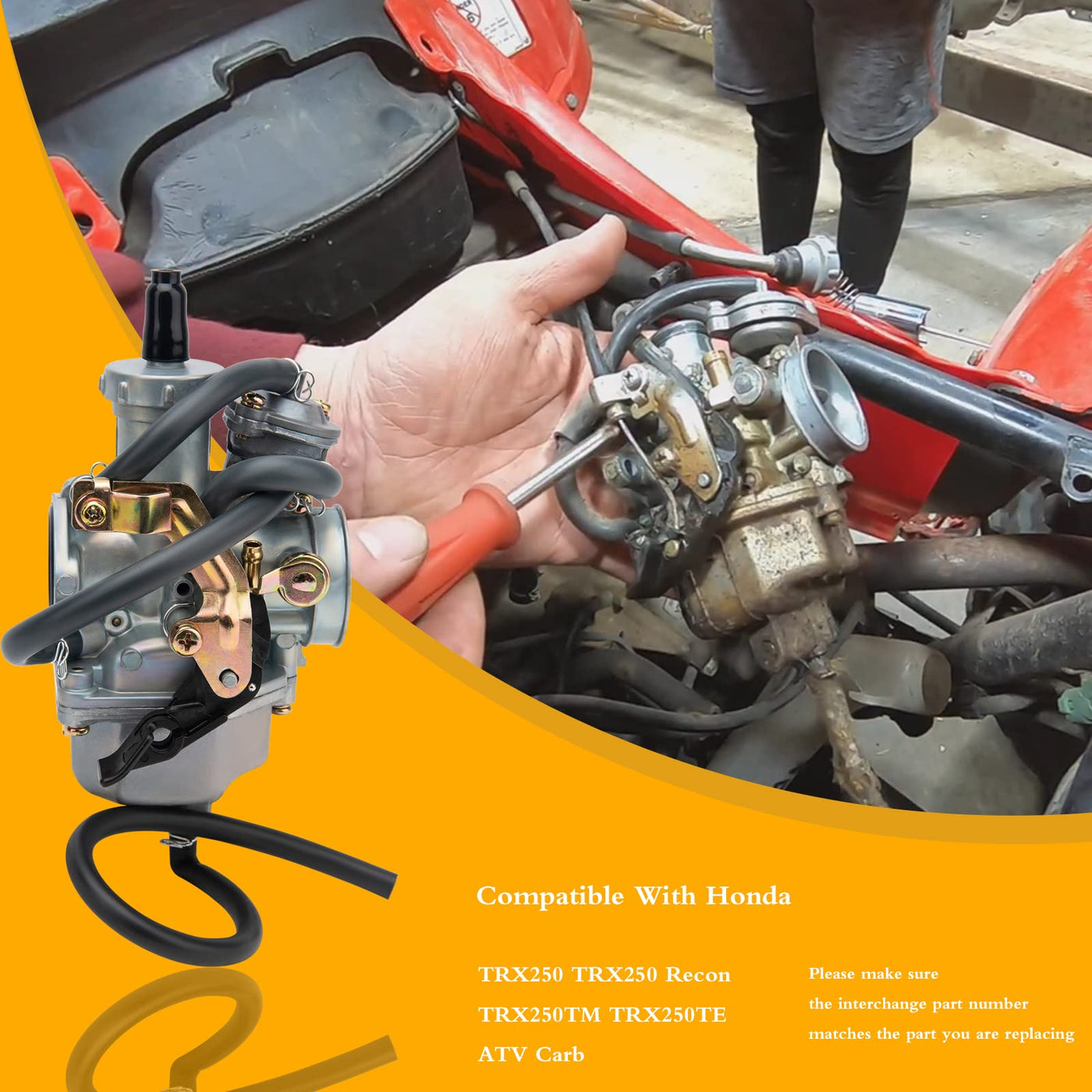 TRX250 Carburetor Compatible with Honda 1997-2001 TRX250 Recon , TRX250TE, TRX250TM 2002-2007 Feature: 1.HIGH PERFORMANCE - Beautifully built with smooth surface,improved air intake holes to improved airflow structure, stable performance and sensitive reaction. 2.PERFECT SOLUTION FOR - The appropriate ratio of air and fuel mixture,provides great power and torque. 3.Easy installation. TRX250 carburetor specifications : Material: Alloy Intake Mount Diameter: 27mm Bolting Hole Distance: 49mm Air Filter Mount Diameter: 38mm Replaces Carb fits Honda Models: Replaces for Honda TRX250 Recon 1997-2001 Replaces for Honda TRX250TE, TRX250TM 2002-2007 Package Includes: 1x TRX 250 Carburetor 1 x Oil Filter 1 x Spark Plug 1 x TRX 250 Air Filter Please check the picture carefully before ordering to make sure the replacement carburetor fits