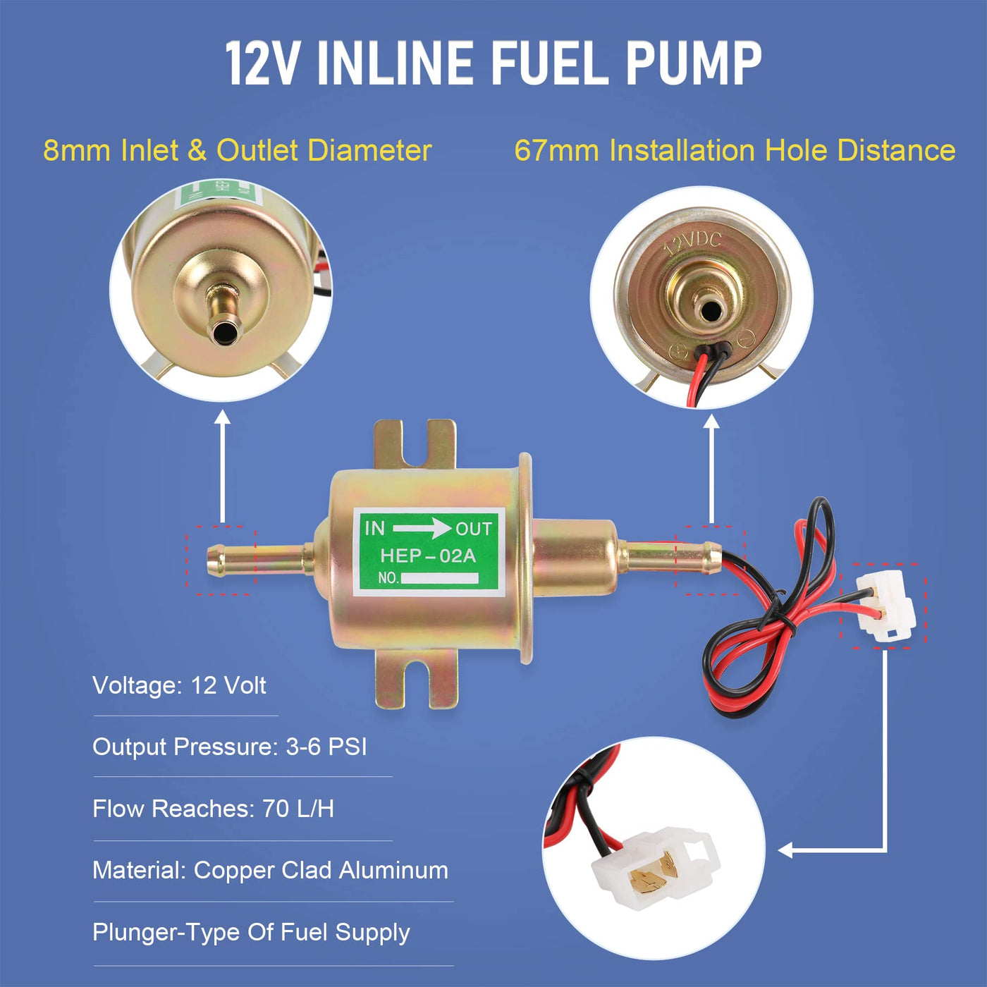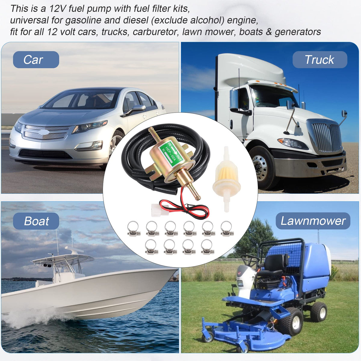 Package Include: 1 X 12V Electric Fuel Pump 1 X Socket Wire1 X Fuel Filter 1 X 5/16'' 6.56 Foot Fuel Line 10 X Hose Clamp This Is A 12V Fuel Pump With Fuel Filter Kits, Universal For Gasoline And Diesel (Exclude Alcohol) Engine, Fit For All 12 Volt Cars, Trucks, Carburetor, Lawn Mower, Boats & Generators Features: Universal Electric Fuel Pump 12V Voltage: 12 Volt Output Pressure: 3-6 Psi Flow Reaches: 70 L/H Hose Size: 8 Mm ( 5/16 Inch ) Material: Copper Clad Aluminum Plunger-Type Of Fuel Supply Build-In Check Valve Designed To Prevent Back Flow.Lightweight And Small Size, Using A Plunger-Type Of Fuel Supply Method To Make Suction Stronger And Oil Supply More Stable Upgrade Check Valve Provides Optimum Traffic, Reducing The Noise Of The Pump So We Can Operate Quietly 3-Layer Thickened Fuel Line Length: 6.56 Feet(2M), Thickness: 2.99Mm Working Pressure: 2Mpa/300 Psi Bursting Pressure: 8Mpa/1200 Psi Cold And High Temperature Resistance (-30To 120) The Inner Tube And The Outer Tube Are Made Of Rubber, And The Middle Reinforcement Layer Is A Nylon Fiber Braided Wire; Resistant To Oil, Cold And Ethanol Fuel Filters And Hose Clamps Are Required For The Use Of Fuel Line, With Which Can Be Used Perfectly With The Electric Fuel Pump