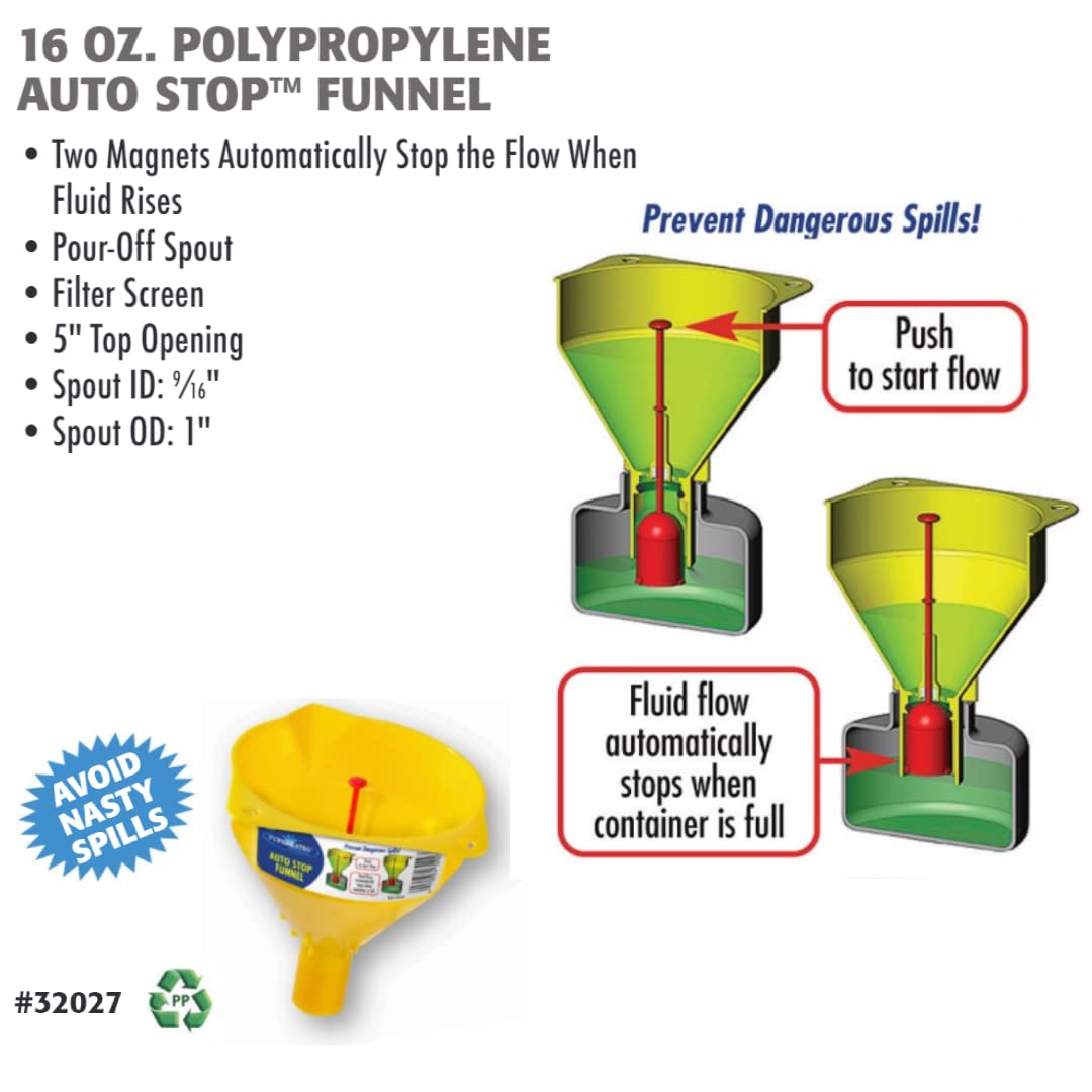 Wirthco 32027 Funnel King Auto Stop Polypropylene Funnel, 16 Oz, Yellow